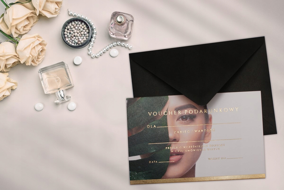 1) ваучер із кольоровим принтом і позолоченим текстом