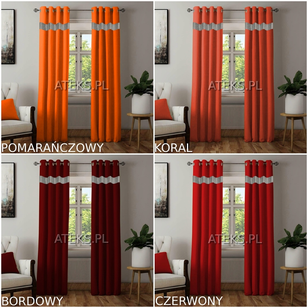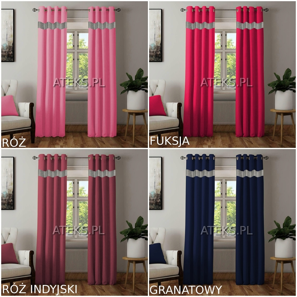 Штора готова з сріблястою стрічкою, що імітує стрази. Ширина срібної стрічки 12 см. Гладкий матеріал - склад 100% поліестер. Штора виконана з сріблястих люверсів. Декоративна штора має зверху вшиту стрічку жорсткості з вставленими в неї люверсами. Напів затемнена штора. Ступінь затемнення приблизно 50%.