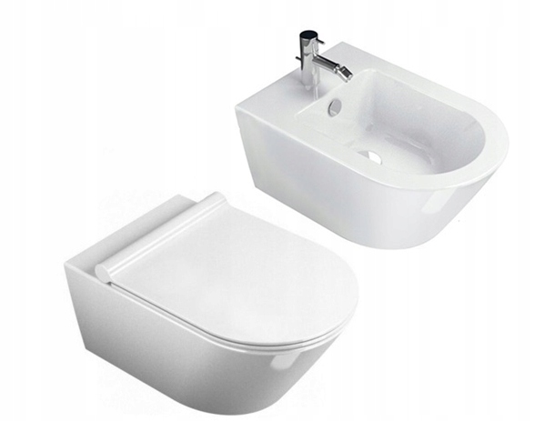 Акуратний овальний унітаз і біде. Покриття NANO, невидиме неозброєним оком, забезпечує бездоганну чистоту та антибактеріальний захист усієї поверхні.