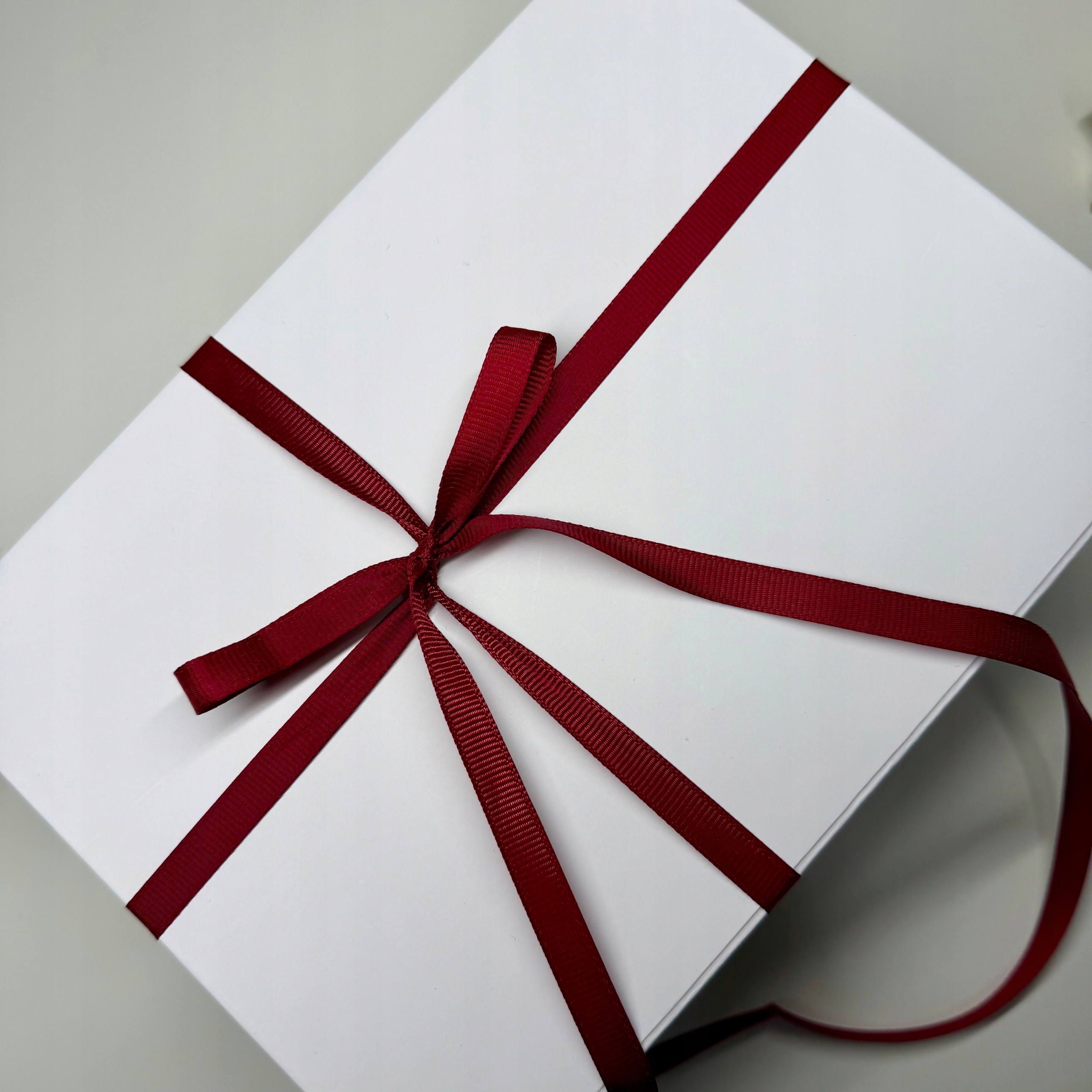 - Розкішна біла коробка, закрита магнітом, прикрашена бордовим бантиком