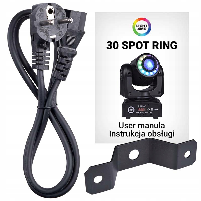 Light4Me 30 Spot Ring — це маленька, легка та компактна міні-світлодіодна рухома головка, яка пропонує багато творчих можливостей освітлення. Налобний ліхтар оснащений потужним ✅ 30 білим центральним діодом, що випромінює точковий промінь, і світлове кільце встановлено навколо основної лінзи, яка містить 12 світлодіодів RGB. Крім того, обладнання має диск із 7 кольорових фільтрів, які забарвлюють світло, і гобо-диск із 7 сучасними візерунками, які формують промінь. На задній панелі є роз'єм живлення, а також вхід і вихід DMX. Спереду встановлена панель управління, яка складається з цифрового світлодіодного дисплея та чотирьох кнопок. За допомогою них ми можемо переміщатися по меню, змінювати налаштування та вибирати ✅один із чотирьох режимів роботи пристрою: