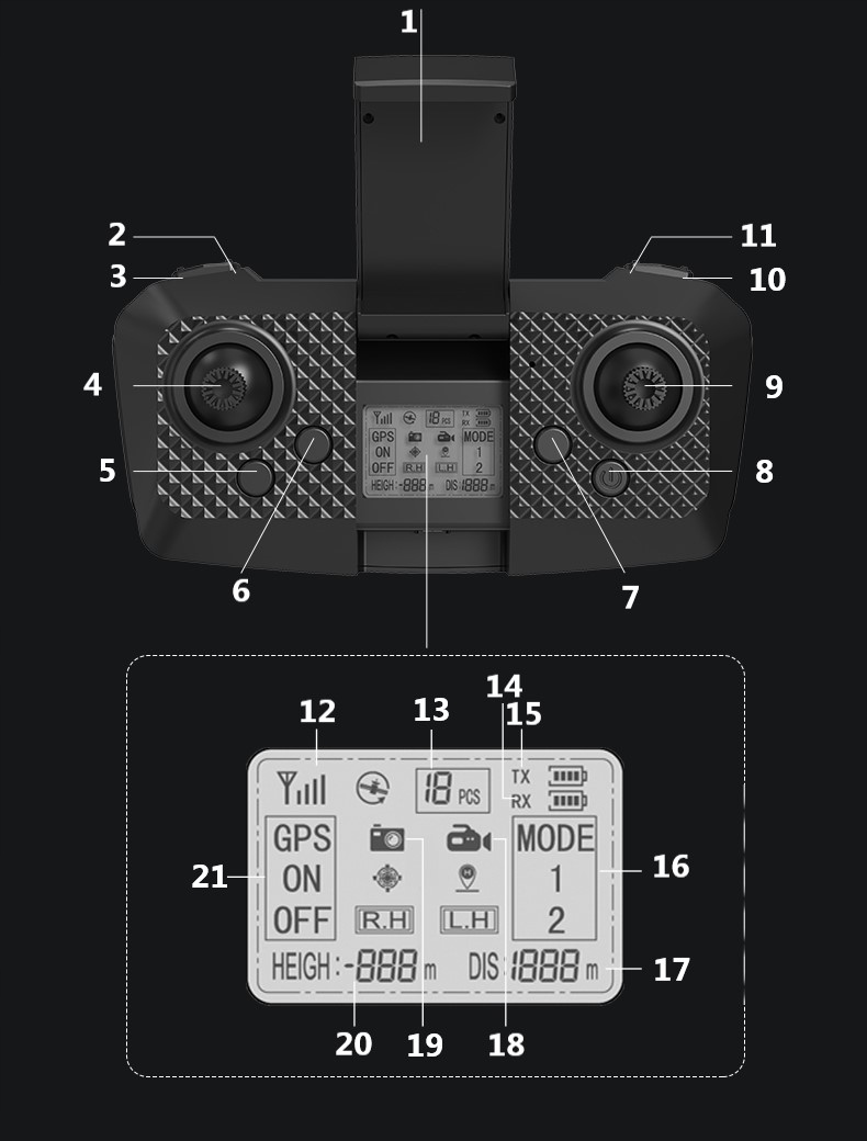 Для керування дроном Контролер використовується в повітрі, він вміщує будь-який мобільний телефон, він зручний і простий у використанні. Розроблений на основі відомих консольних контролерів.