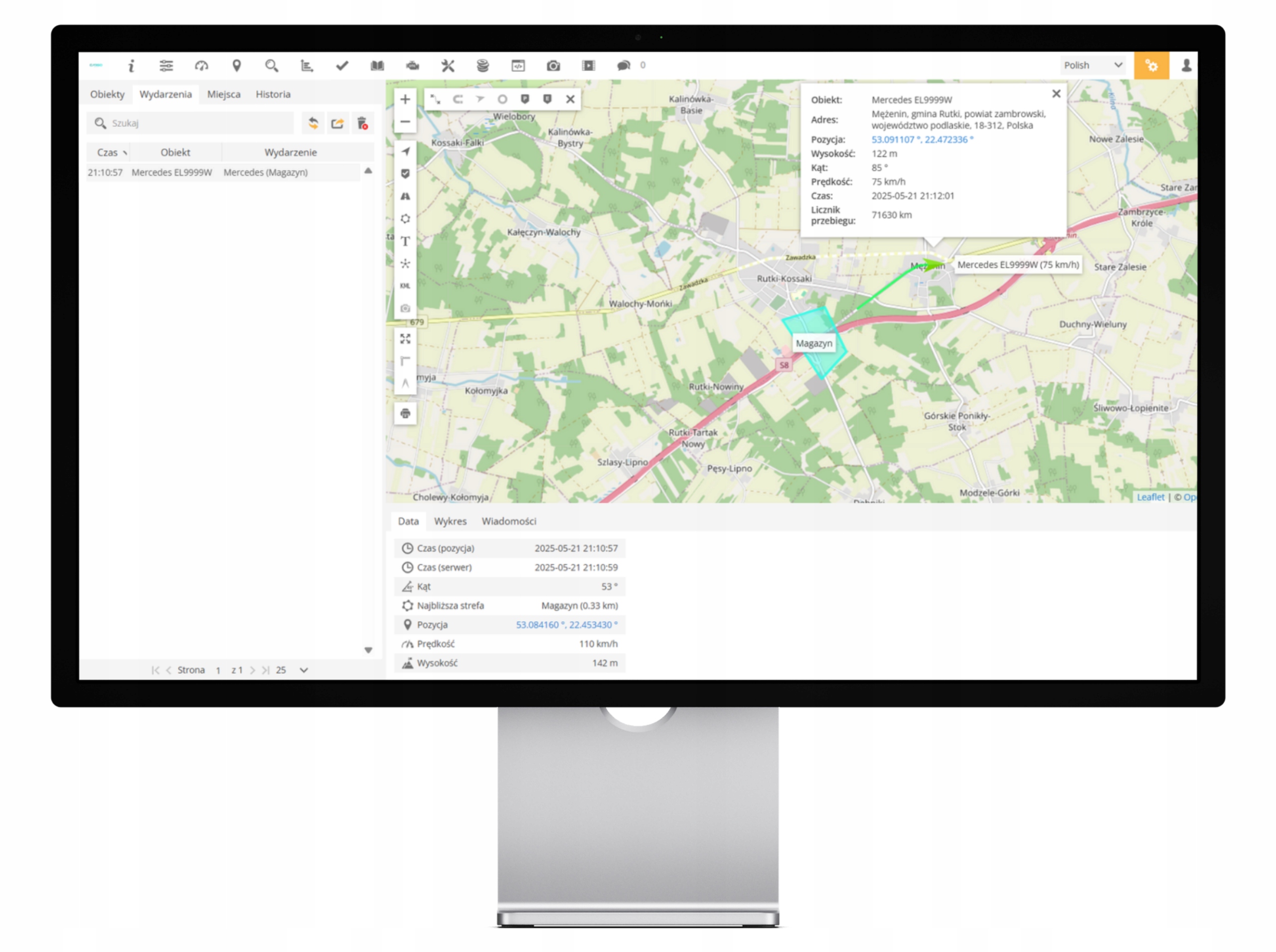 Нижче наведено приклад звіту "Події", який показує детальну інформацію про діяльність автомобіля в певний момент, напр. автомобіль уже покинув вантажний склад - включаючи, серед іншого, місце розташування на карті, швидкість, положення GPS, висоту, кут і час події.