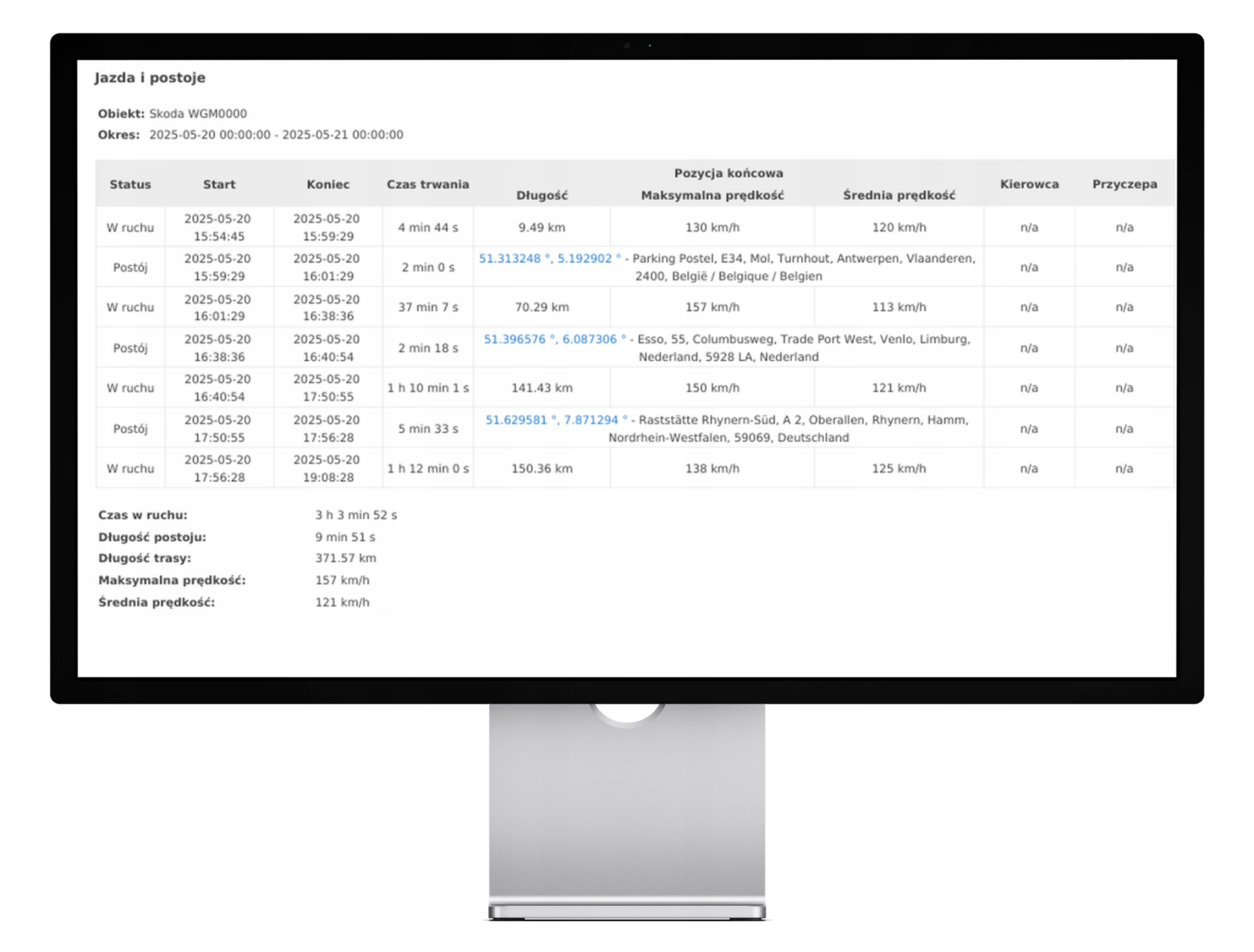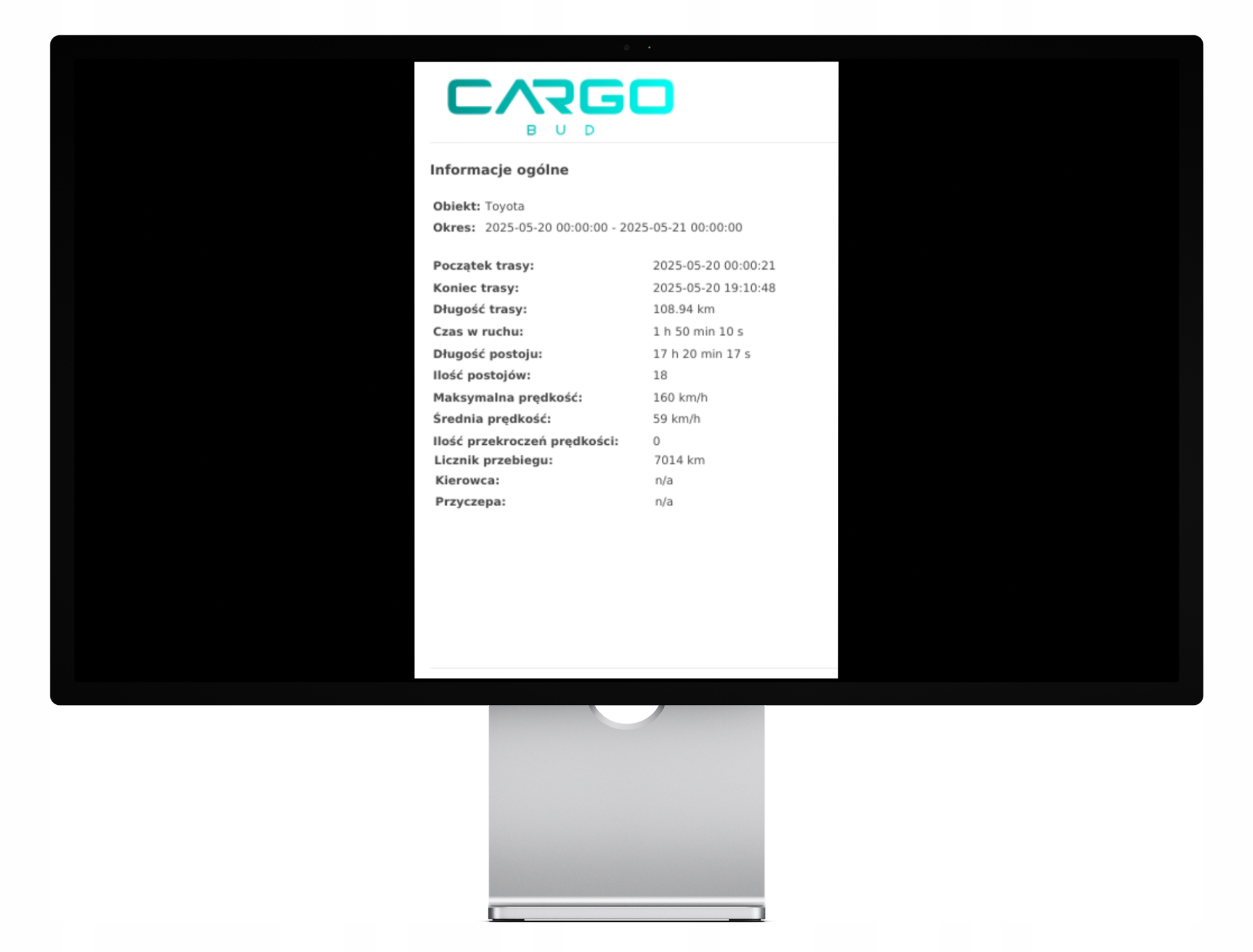 У звіті, що додається нижче, ви можете переглянути зразки даних із системи CargoGPS, де детально показано кожну ділянку маршруту, зупинки, швидкість і навіть час роботи двигуна. Це потужний інструмент, який дозволить вам:
