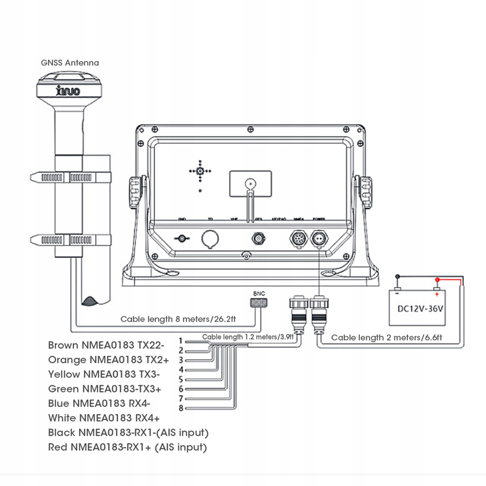 - Інтерфейс: 2 канал для виходу NMEA0183, 2 каналу для введення NMEA0183 (LIELE: Один з них, швидкість переходу, може встановити незалежність) DC 12V to 36 V