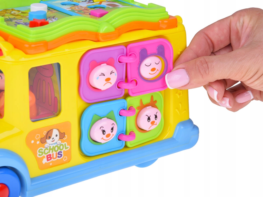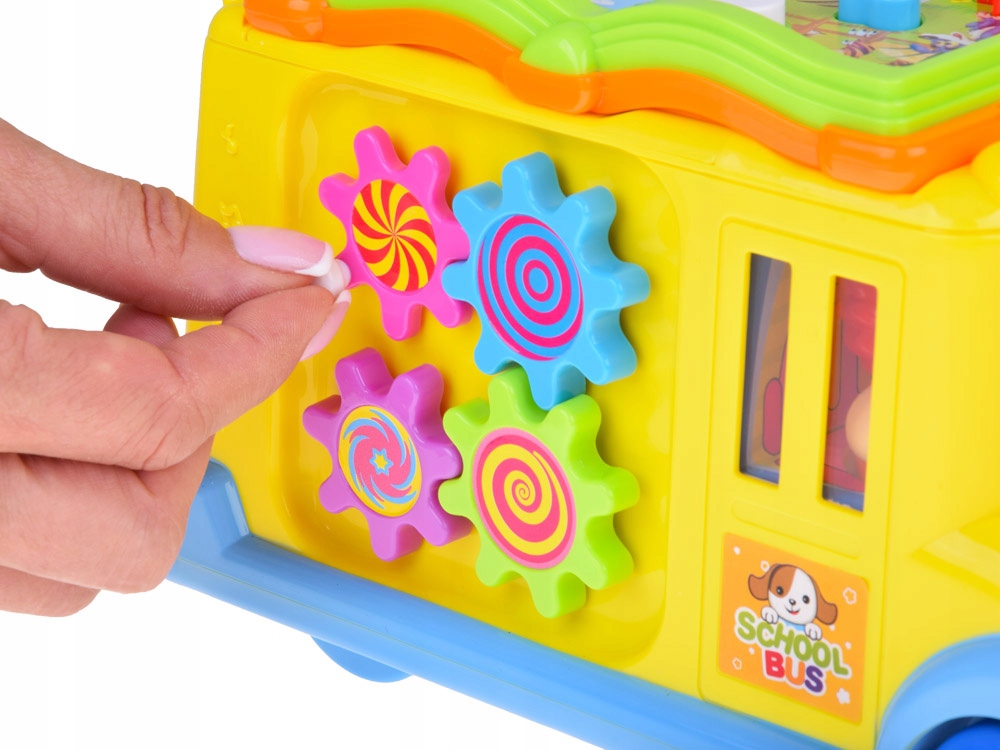 У передній частині автобуса є різнокольоровий обертовий ролик із тваринами, обертання якого викликає звуки дитини, що сміється, і мелодії.