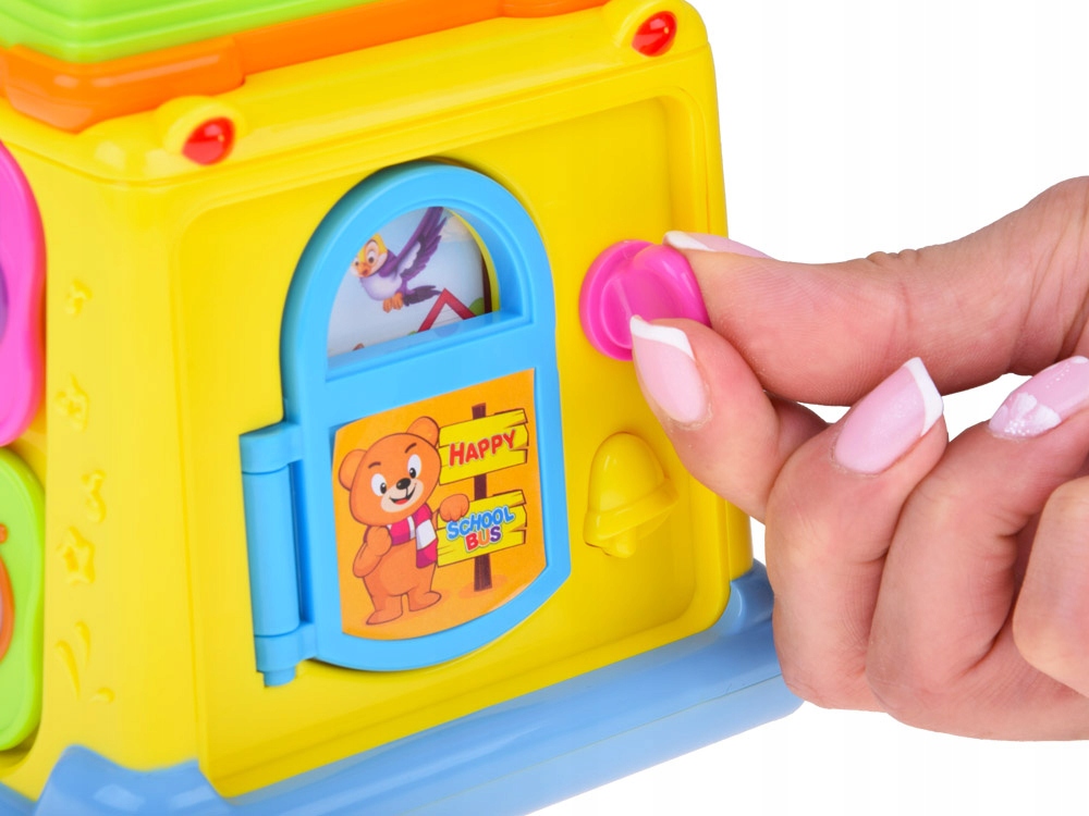 Ззаду іграшки є дверцята з дзвіночком, який видає звук. За дверима є кольорові малюнки, які змінюються, коли ви повертаєте ключ.