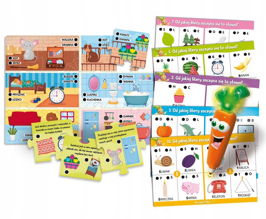 Багато інтерактивних карток, щоб вивчити алфавіт і знайти багато простих слів із розмовною та сяючою Каротиною! У комплект також входить головоломка-будиночок із веселими загадками.
