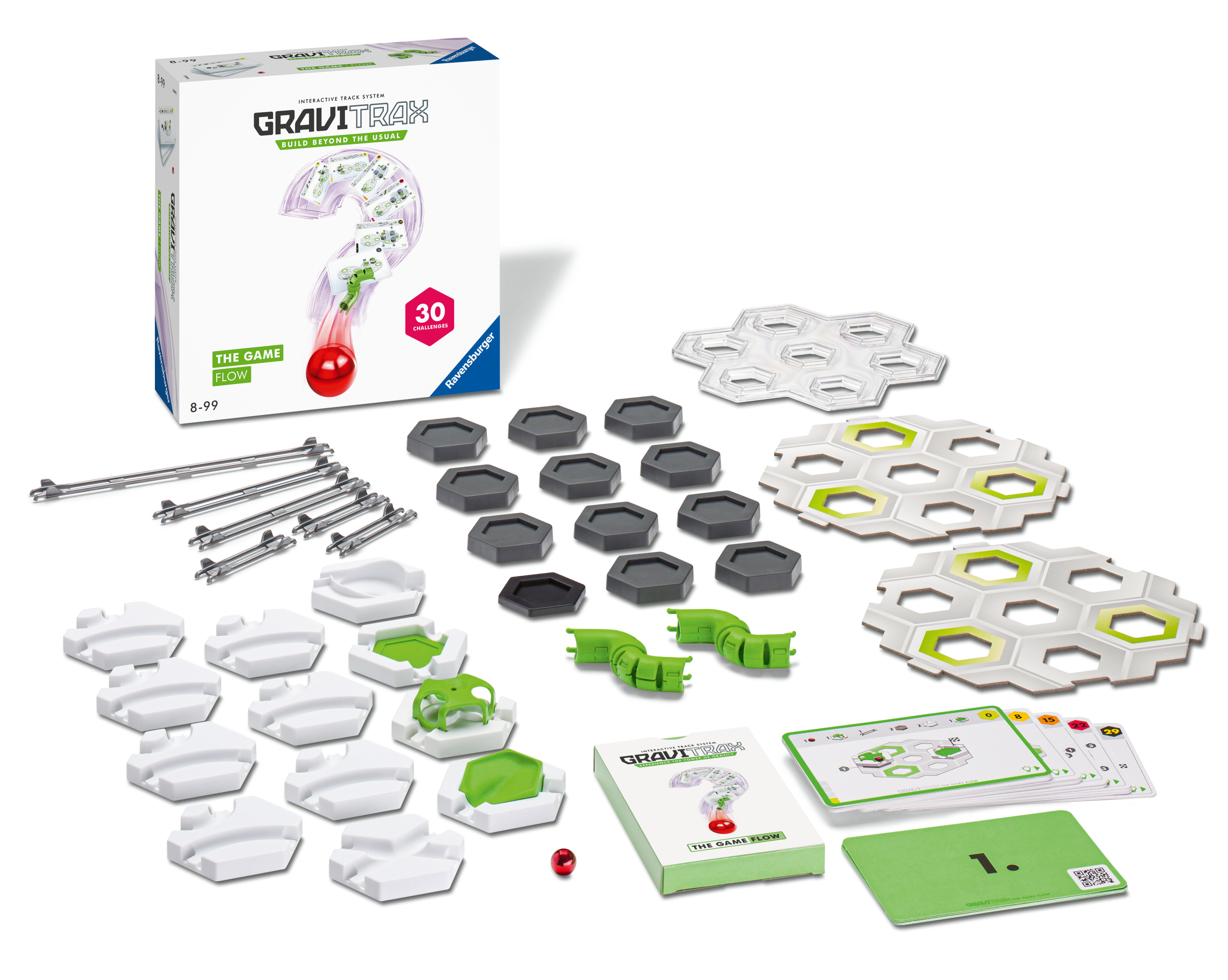 GraviTrax The Game Flow запрошує вас на захоплюючу розвагу у вирішенні логічних і просторових головоломок. Гра передбачає побудову доріжки відповідно до вказівок на картці та переміщення м’яча по побудованій системі шляхів.
