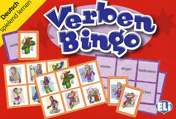 Verben-Bingo — це мовна гра, призначена для початківців і середнього рівня, яка включає в себе зіставлення витягнутих карток із назвами дій або малюнків, що ілюструють назви дій, до відповідників на дошках. У набір входить інструкція з описом різних варіантів гри. У набір входить: 66 гральних карт, 36 дощок, інструкція