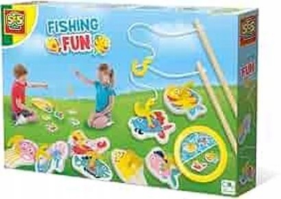 Цей веселий рибальський набір ідеально підходить для ігор у приміщенні та на відкритому повітрі, його можна використовувати сухим, на траві або прямо у воді (риба плаває). Набір призначений для двох гравців, які можуть змагатися, хто зловить більше кольорових рибок. У набір входить: Дерев'яні вудки: 2 міцні дерев'яні вудки. Пінопластові рибки: 8 веселих ілюстрованих рибок і морських тварин з пінопласту (з пластиковими гачками/вічками). Рибальські гачки: пластикові гачки, які кріпляться на вудки. Текстильна сумка: практична текстильна сумка для зберігання та перенесення набору.