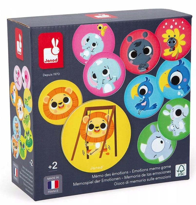 Гра на пам'ять "Емоції" від французького бренду JANOD - чудова розвага для одного або кількох дітей. Він складається з 23 (12 пар) твердих картонних круглих жетонів різного кольору з фігурками тварин. Тварини повинні бути зібрані - пара складається з цілої фігури і її морди, що виражає емоції, в тому числі: смуток, закоханість, захоплення або збентеження. Виграє гравець, який збере більше пар. Гра на пам'ять тренує пам'ять, концентрацію, сприйнятливість і рефлекси. Іграшка розроблена та виготовлена у Франції. Упакований в естетичну картонну коробку. Ідеальний подарунок. Ігри стимулюють уяву, стратегічне мислення та планування. Це чудова розвага для всієї родини.