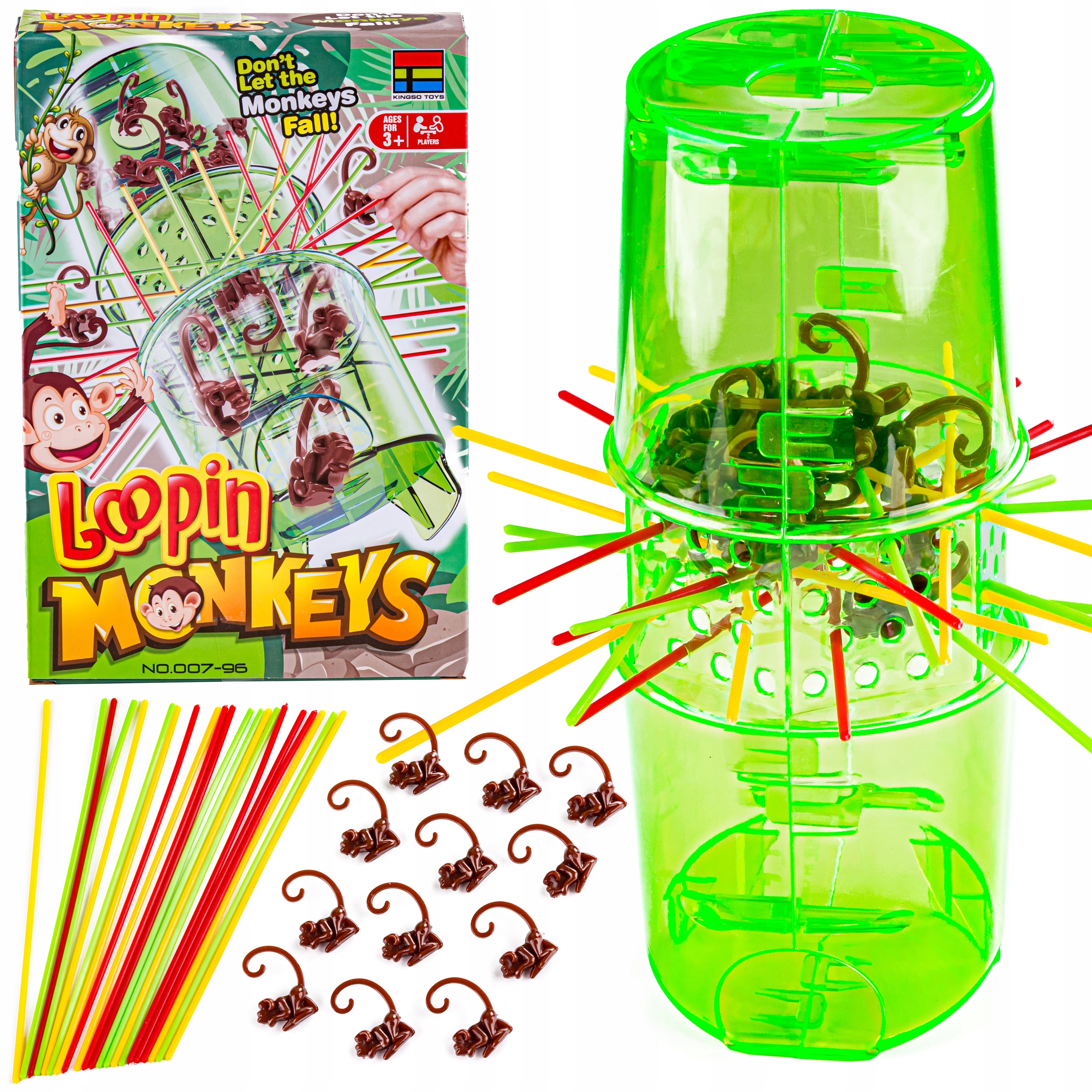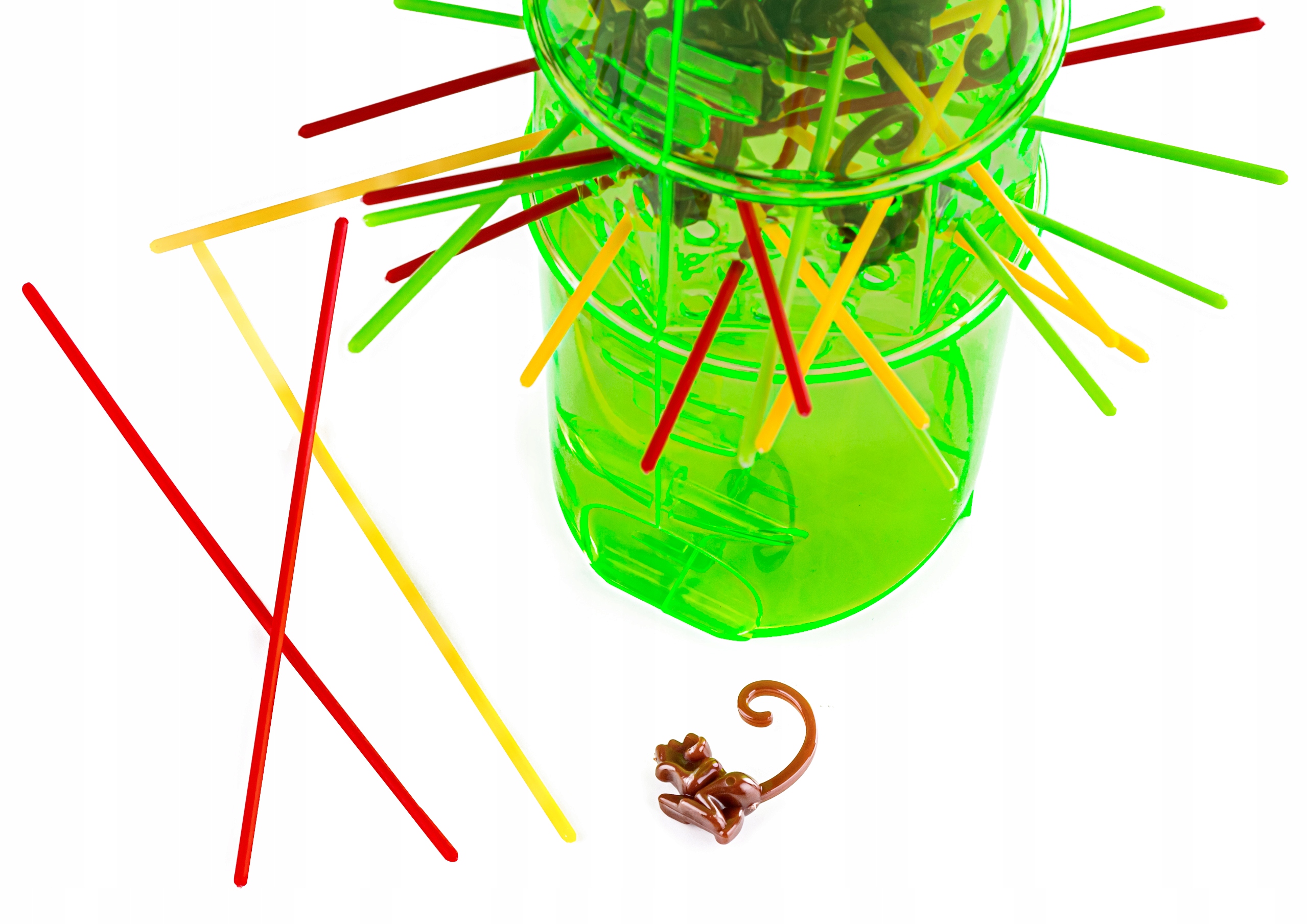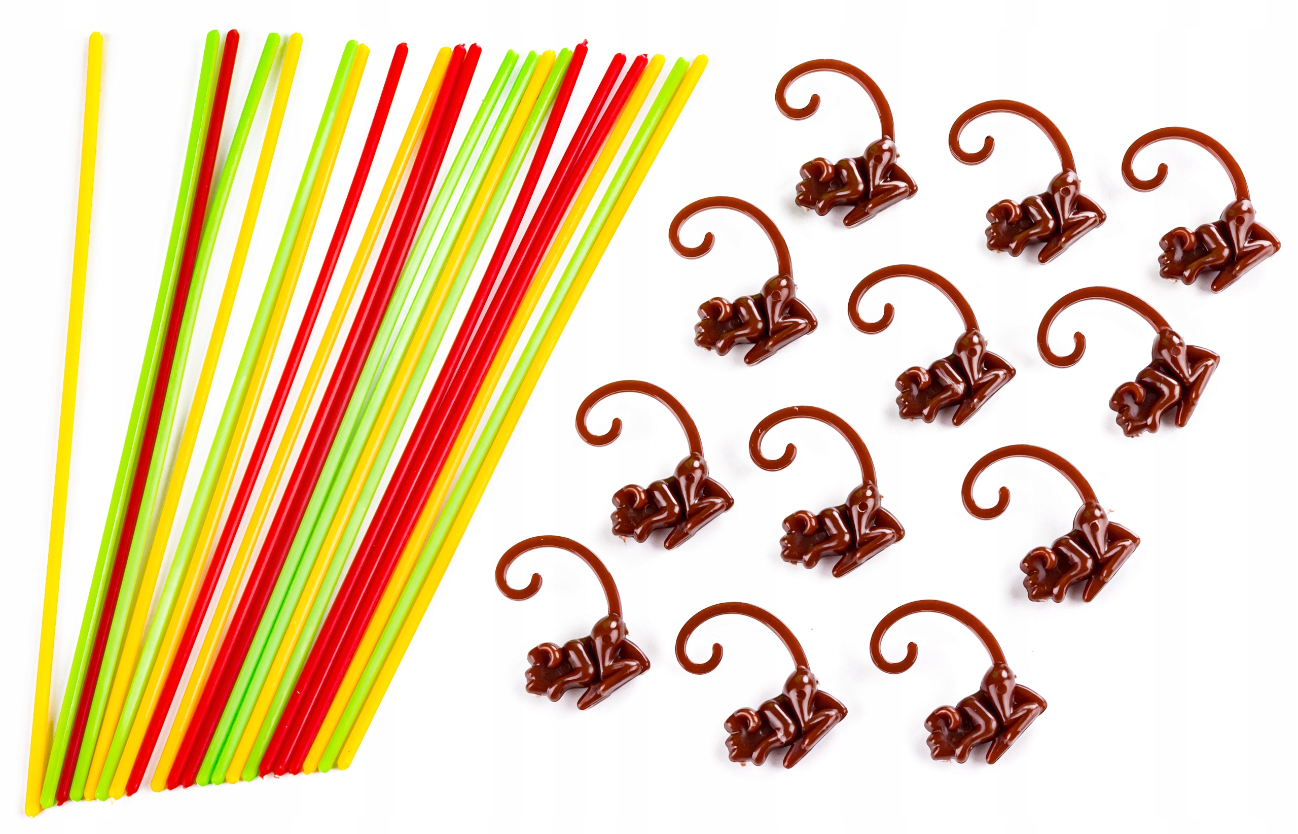 Ми кладемо гілки - кольорові соломинки - по 7 кожного кольору в отвори нашої вежі. Зверху закидаємо всіх мавп в отвір у вежі, щоб вони висіли на гілках/шматках. Якщо якась мавпа падає на основу, ми піднімаємо її і кидаємо зверху, поки всі вони не повиснуть на гілках. Після початку гри кожен гравець по черзі обережно витягує соломинку будь-якого кольору. Гравець розміщує мавп, які падають на дно, перед собою. В кінці гри ми підраховуємо наших приматів. Перемагає той, хто скине з вежі найменшу кількість мавп.