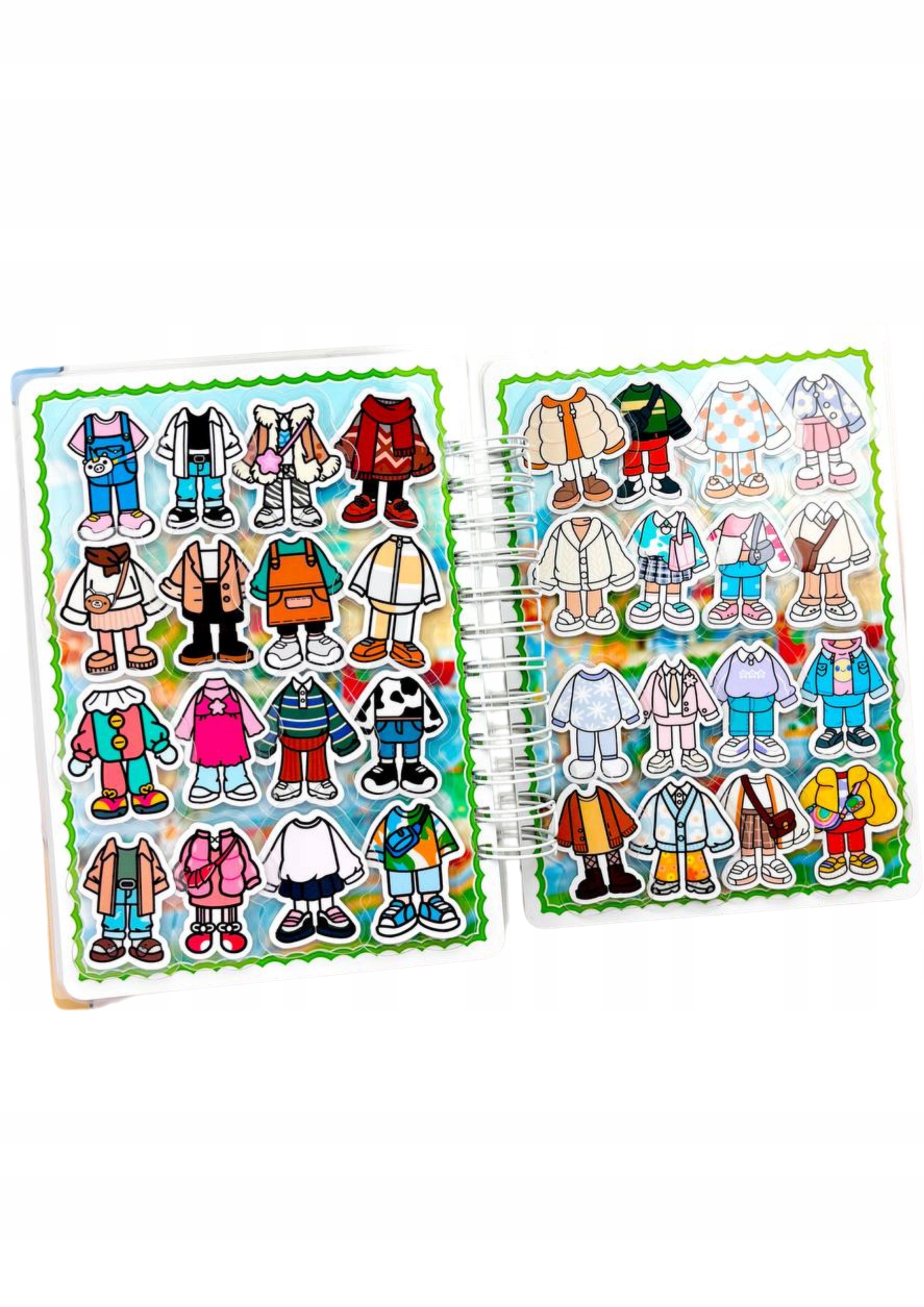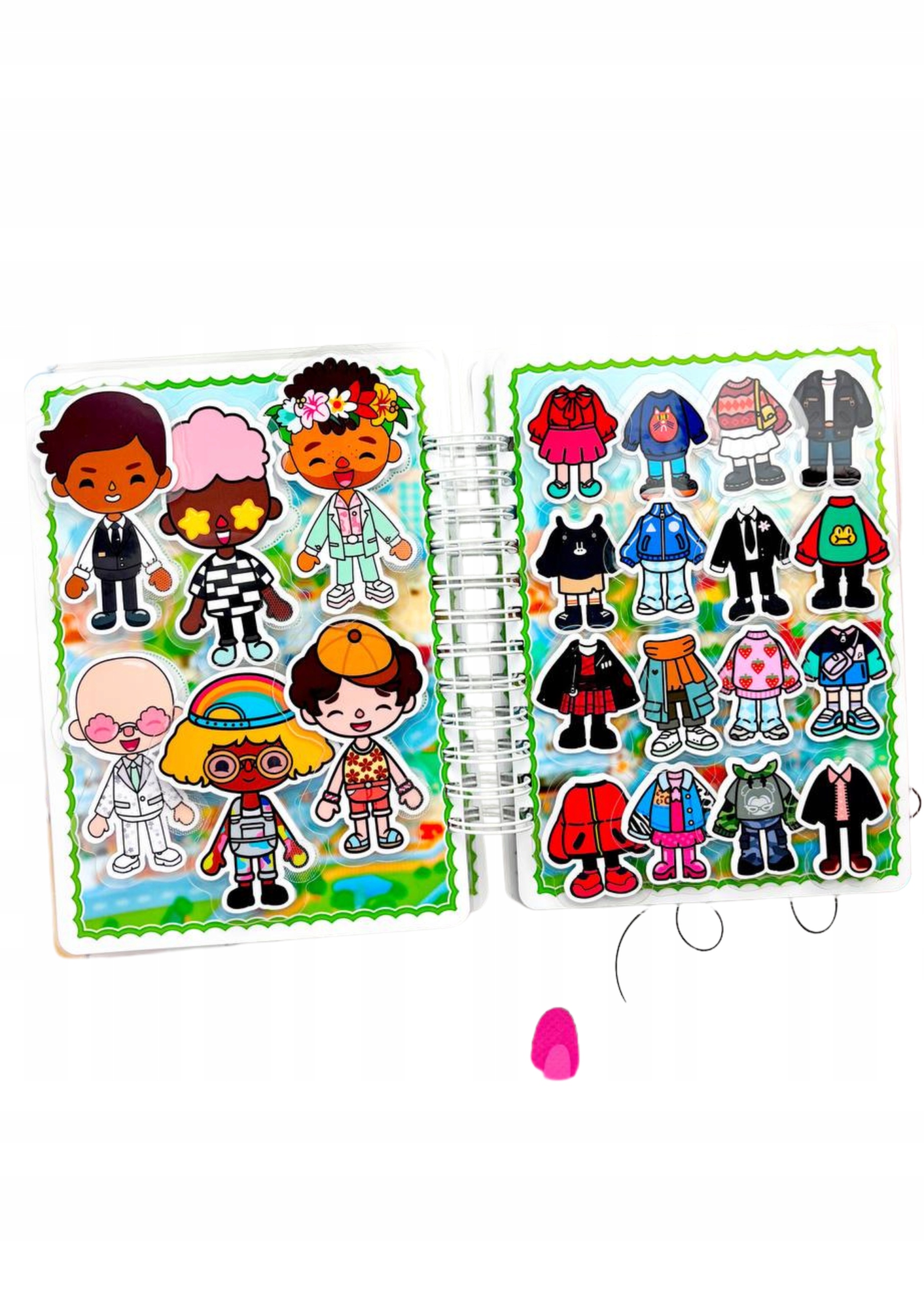 У книзі ви знайдете 30 унікальних персонажів. Кожен з них чекає, коли малюк вибере ідеальне вбрання для різних випадків: сонячний день на пляжі, дощова прогулянка по парку, урочиста вечірка.