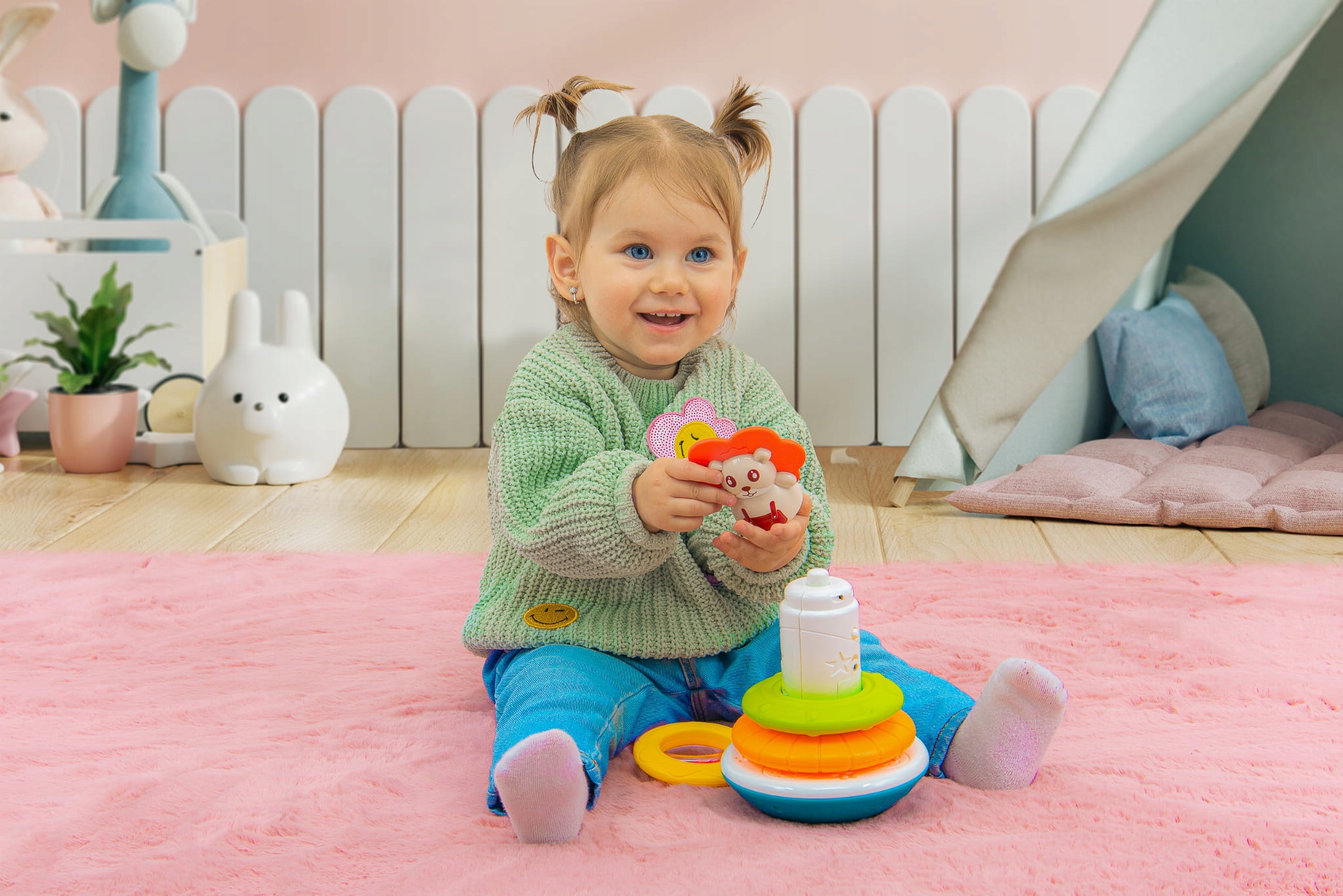 Ця унікальна іграшка поєднує навчання з розвагою, пропонуючи різноманітні сенсорні враження для вашої дитини. Інтерактивна основа піраміди реагує на кожне положення обода. Одягнувши кільце, воно видає вашому малюку веселі звуки та мелодію. Доступно цілих 8 різних мелодій і звуків. Не тільки це! Округла конструкція основи дозволяє м’яко розгойдувати іграшку, що вчить дитину розуміти причину та наслідок.