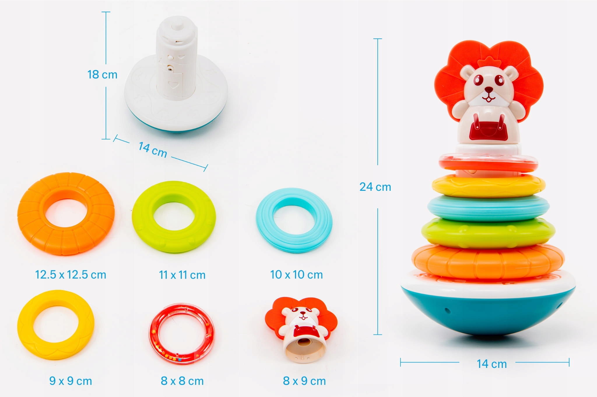 Піраміда складається з п'яти різнокольорових кілець, верхнє з яких виконує роль брязкальця, додаючи грі енергії та динаміки. Крім того, гумова левова грива у верхній частині вежі є ідеальним прорізувачем, особливо корисним під час прорізування зубів.