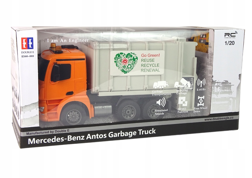 - Конструктор на дистанційному керуванні для дітей встановлено на колеса з протекторами. Ця іграшка являє собою реалістичну модель сміттєвоза. Дитяча сміттєвозка з дистанційним керуванням управляється за допомогою пульта дистанційного керування 2.4G, що входить у комплект. Пульт дистанційного керування можна використовувати для руху вперед, назад і вбік. На сміттєвозі є кнопка, яка керує підйомом і опусканням кошика. Друга кнопка активує гвинтові преси, які затягують сміття всередину. Вантажний відсік, що відкривається та нахиляється, допоможе вам випорожнити вміст.