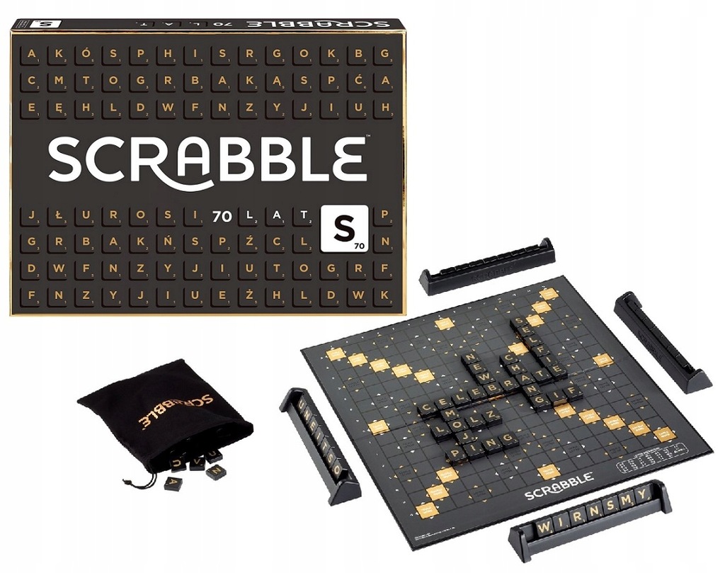 Scrabble - найпопулярніша гра слів у світі. Він змінився з покоління в покоління з часом проходження та поточними тенденціями. Щоб відсвяткувати 70 років присутності Scrabbli на ринку, Mattel Mark представив ювілейне видання гри. У елегантній упаковці є чорна дошка зі спеціальними полями, надрукованими на золотих фользі, та 100 чорних плиток із золотистими пресованими літерами. Мета гри залишається незмінною - кожен гравець намагається отримати якомога більше очок, впорядковуючи слова таким чином, щоб використовувати значення букв та бонусних полів на дошці.