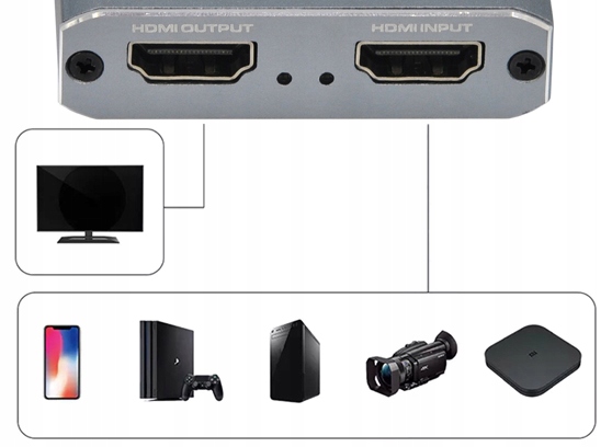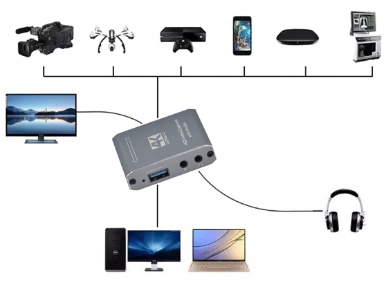 Зображення, надіслане через роз’єм HDMI із камери, камери, ігрової консолі, комп’ютера та навіть із смартфон можна перенаправляти на будь-який екран, дисплей або інший приймач HDMI і одночасно записувати через швидкий USB 3.0 на будь-якому пристрої, наприклад комп’ютері чи смартфоні .