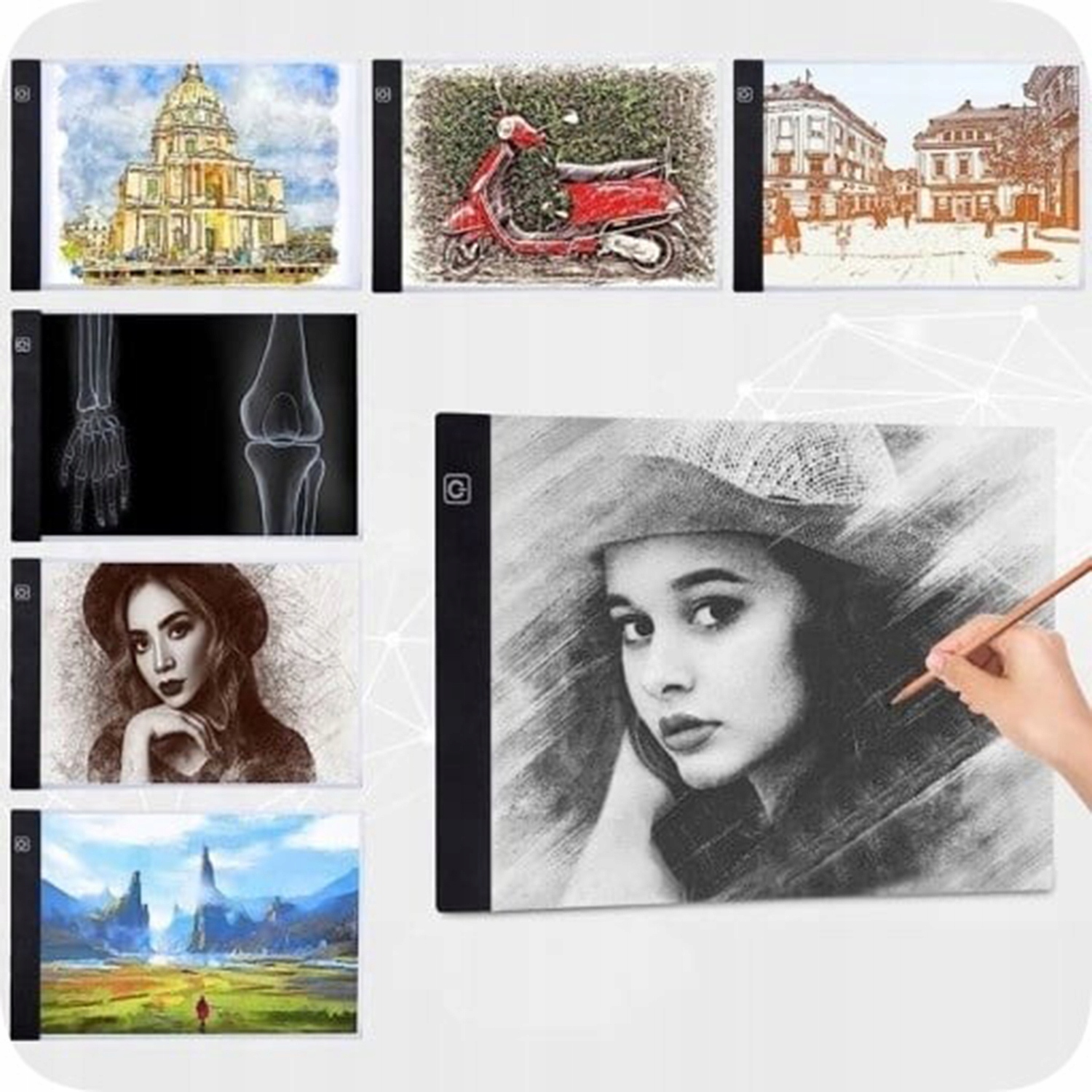 2) підходить для малювання діамантами, відстеження анімації художників, носіння татуювань, ескізних студентів, інженерних малюнків, перегляду X -променів тощо.