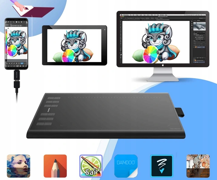 Планшет працює з Win 7 Системи /8.1 /10 і Mac OS X10.10.0 або вище. Продукт сумісний з усіма основними графічними програмами, наприклад: Adobe Creative Cloud suite, Photoshop, Lightroom, Illustrator, Corel Painter, Corel Draw, SketchBook, Comic Studio, Paint Tool SAI, Manga Studio, 3DS MAX, Autodesk MAYA, Zbrush, Krita, Gimp, Black Ink тощо.