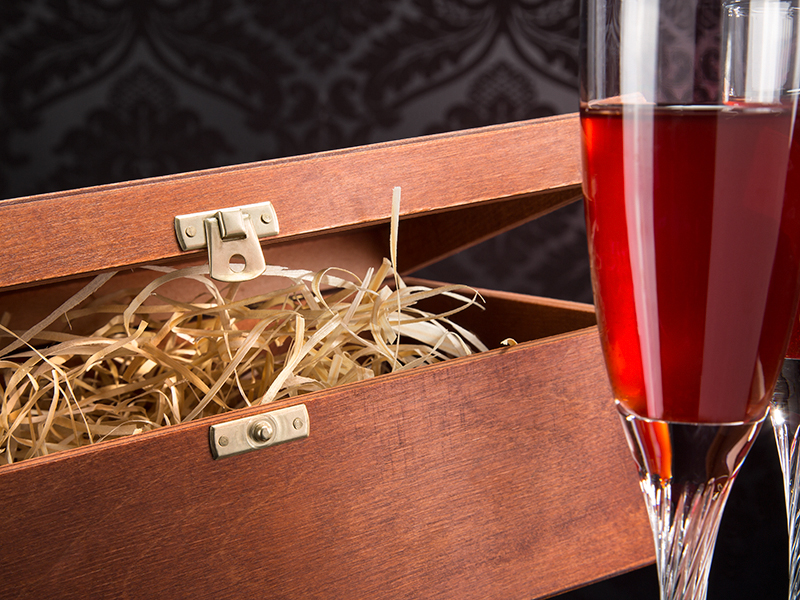 - дерев'яний футляр, покритий лаком і вітражами із золотою фурнітурою + деревна вовна