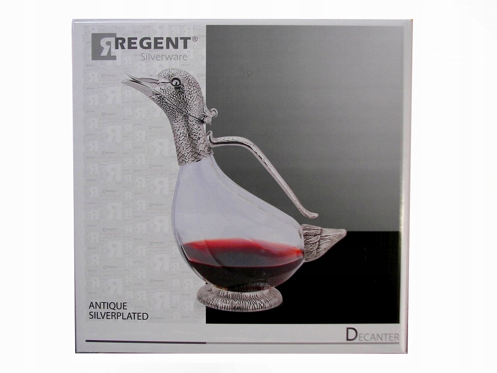 Запрошую придбати гарний графин для вина в стилі 19 століття, графин виготовлений зі скла. До верхівки скляної колби приклеюється голова качки, аналогічно кріпляться ніжка і хвіст (сплав цинку, кольоровий метал з латунним покриттям), верхня частина голови кріпиться до нижньої за допомогою петля, через отвори протягується заклепка, тому верхня частина може трохи з'їхати в сторони. На заливку це не впливає.
