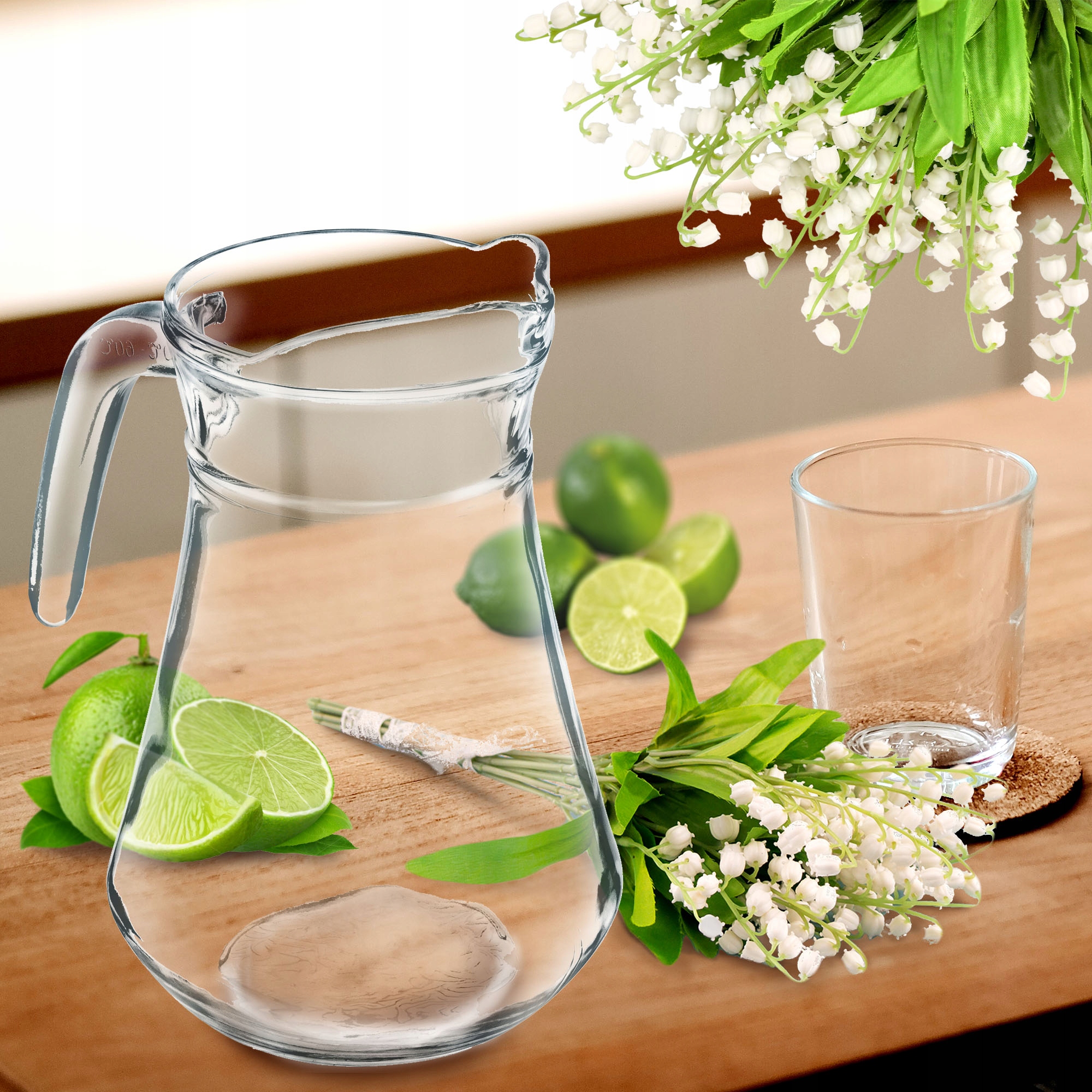 Глечик має товсте дно і досить масивний, тому чудово підійде не тільки для вечері вдома, а й для вечірки або барбекю на природі. Виріб виготовлено з міцного скла, стійкого до пошкоджень і ударів, що забезпечує захист напоїв усередині. Додатковий захист забезпечує зручна ручка, яка добре лежить у руці та дозволяє зручно наливати соки, воду, лимонад та газовані напої.