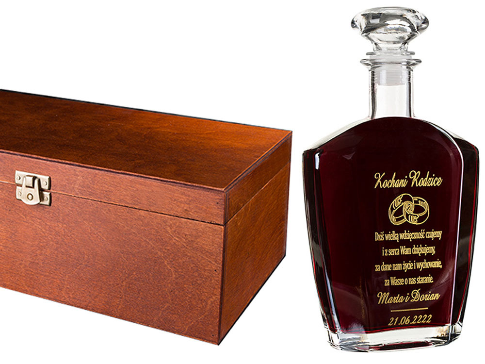 Не можете вирішити, який подарунок вибрати як подяку батькам? Збираєтеся на сімейне свято і не знаєте, що купити імениннику? Купіть цей графин! Це красивий виріб, сформований вручну, що робить кожен унікальним. Крім того, вона гравірується на високоякісному лазерному плотері, а гравірування наноситься майстром вручну дуже ретельно спеціальною фарбою. Позолочене/срібне покриття переливається на світлі, що дає дивовижний ефект. Крім того, в набір входить ящик з дуже дорогої березової фанери товщиною 8 мм в кольорі суміш палісандра і червоного дерева. Зовні вся коробка покрита лаком, що надає їй легкого блиску. Крім того, він має стару золотисту застібку та петлі. Ми додаємо безкоштовну начинку з дуже високоякісних необроблених дерев’яних смуг. Одержувач, безсумнівно, буде в захваті, коли побачить такий гарно зроблений подарунок :) p>