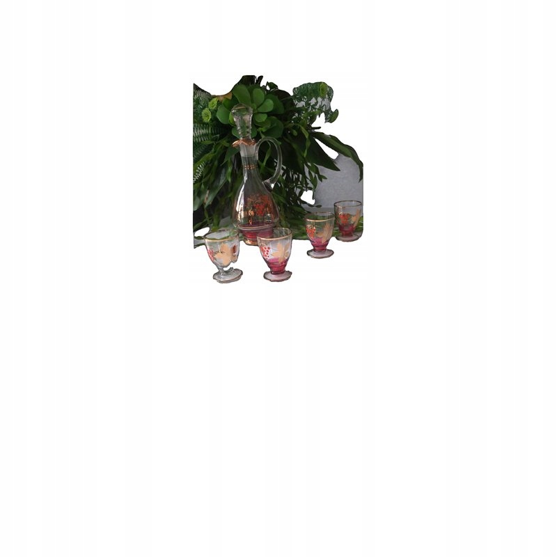 Графін з шістьма склянками в дуже хорошому стані, розміри: висота графина 23 см, висота склянки 6 см, діаметр чаші 4,5 см. Одна склянка іншого кольору, але вона з комплекту.