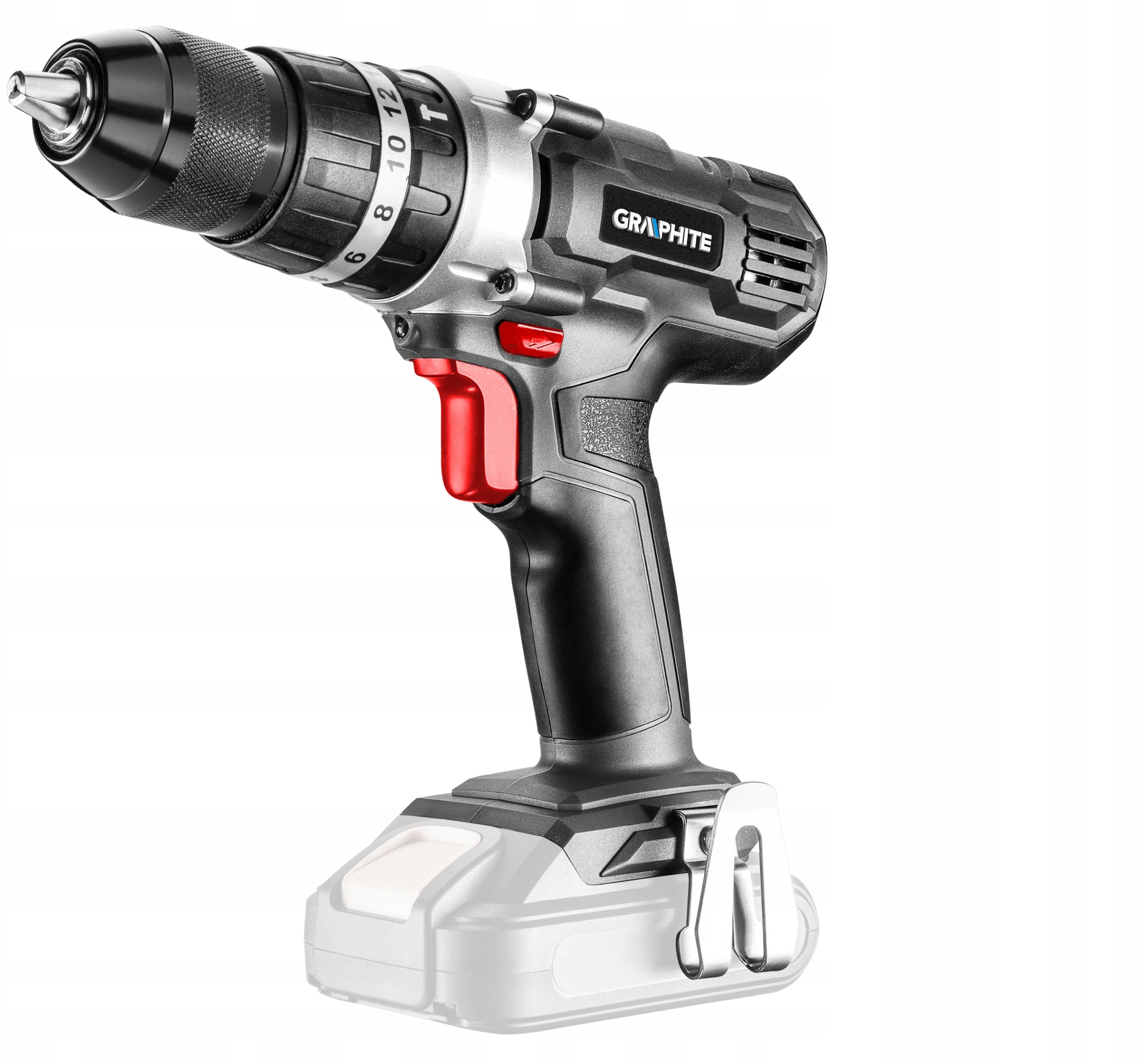 Двошвидкісний ударний дриль/шуруповерт GRAPHITE, сумісний з літій-іонними акумуляторами 18 В GRAPHITE Energy+. Електроінструмент має плавне регулювання швидкості і оснащений перемикачем напрямку обертання. Самозажимний тримач дозволяє використовувати аксесуари діаметром 2-13 мм. Максимальна швидкість шпинделя на першій передачі становить 350, а на другій передачі 1250 об/хв. Частота механічного впливу на першій передачі досягає 5250, а на другій передачі досягає 18750 ударів на хвилину. Максимальний крутний момент становить 35 Нм (м'яке загвинчування) / 55 Нм (жорстке) і може регулюватися за допомогою 16-швидкісної муфти з додатковим перемикачем швидкого режиму для загвинчування, свердління та ударного свердління. Апарат оснащений електродвигунним гальмом і автоматичним блокуванням шпинделя. Світлодіод, що активується автоматично, освітлює робочу зону. Ергономічна форма рукоятки та компактна конструкція дриля/шуруповерта дозволяють комфортно працювати навіть у складних умовах. Ручка покрита матовою
