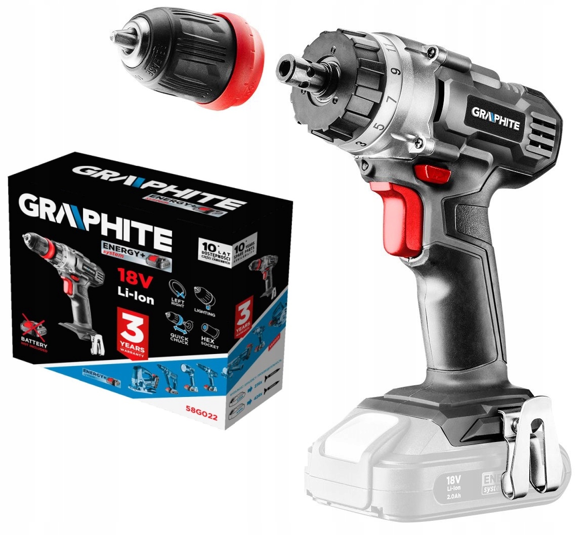 - Двошвидкісна GRAPHITE дриль/шуруповерт, сумісна з літій-іонними батареями 18V GRAPHITE Energy+.