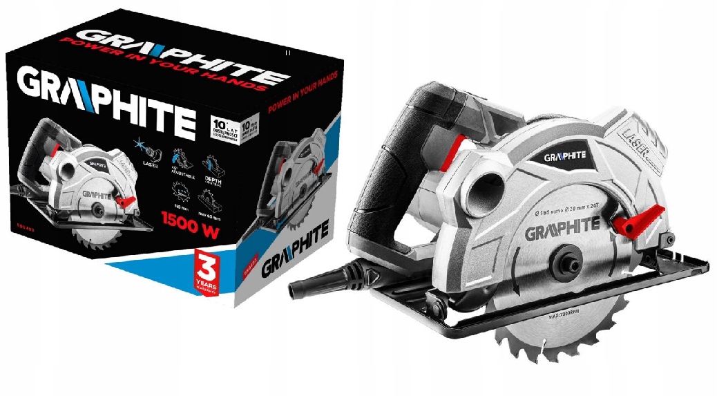 Циркулярна пила GRAPHITE з двигуном потужністю 1500 Вт, що дозволяє працювати на швидкості до 5800 об/хв. Апарат призначений для роботи з дисками із зовнішнім діаметром 185 мм і дозволяє різати матеріали товщиною до 65 мм. Також можливий розріз під кутом до 45°. Кут і глибина різу регулюються без використання інструментів - в установці параметрів допомагають спеціальні шкали. Безпека оператора забезпечується двоступеневим перемикачем, який захищає від випадкового запуску. Комфортне та безпечне ведення електроінструменту забезпечує додаткова дугоподібна ручка з широкою поверхнею захоплення. У видимому для оператора місці є індикатор підключення електроінструменту до мережі та його готовності до роботи. Основна кришка екрану виготовлена з алюмінієвого сплаву. Лазерний покажчик, вбудований у пристрій, полегшує визначення напрямку різання. Паралельна напрямна, що входить у комплект, дозволяє точно направляти пилку вздовж краю матеріалу.