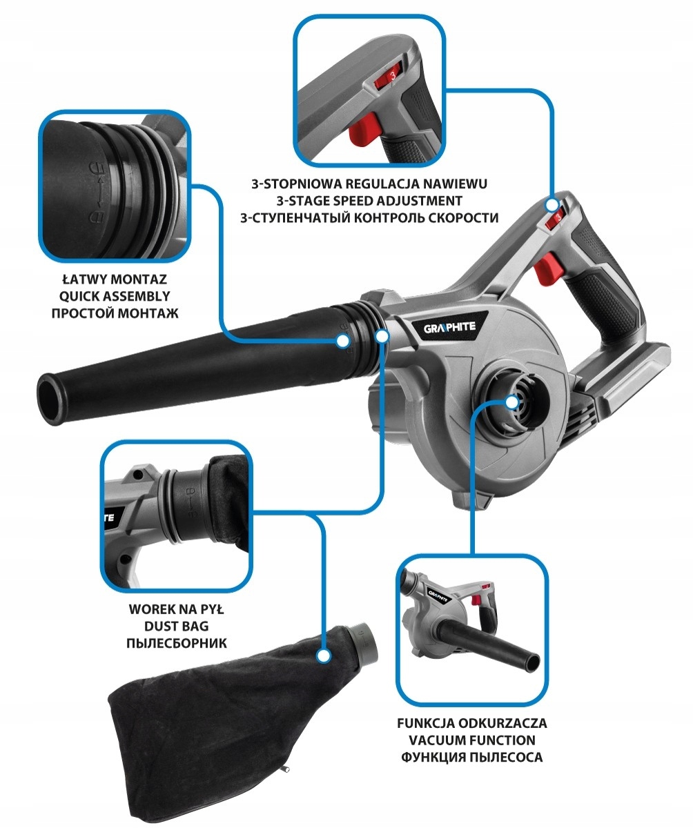 ГРАФІТОВА ПОДУВОДУВКА ТА ПИЛОСОС 2в1 АКУМУЛЯТОР 18В 58GE118