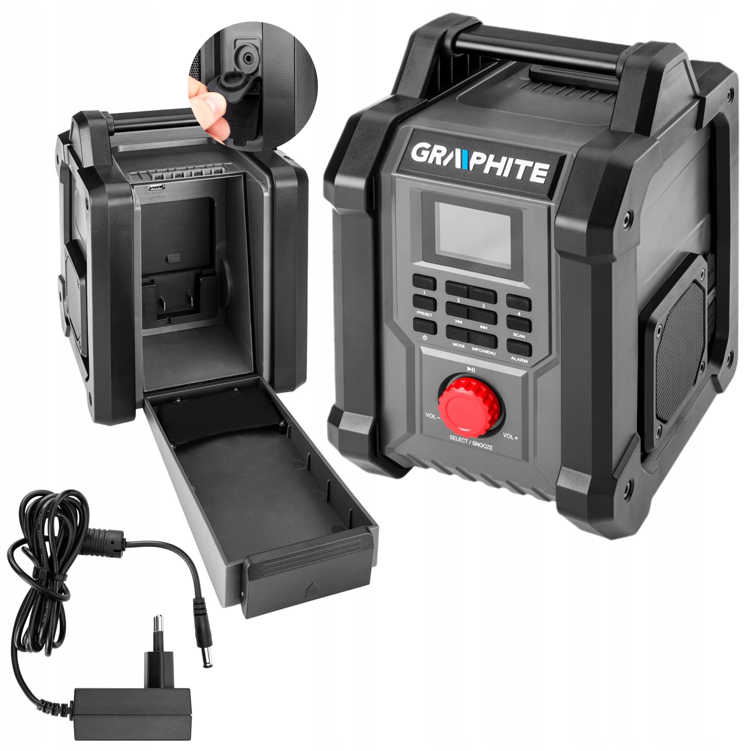 Пристрій має набір з двох динаміків, кожен потужністю 15 Вт, а також практичний кольоровий екран діагоналлю 2,4 дюйма для відображення, наприклад, поточної частоти. Радіо дозволяє використовувати функцію FM (30 станцій, в діапазоні 87,5 - 108 мГц), DAB (30 станцій, в діапазоні 174 мГц - 240 мГц) або зручно перемикатися в режим Bluetooth 5.0. Також є функція сну, будильник і годинник з автоматичним налаштуванням. Це надзвичайно міцний пристрій від бренду GRAPHITE, який зробить вашу роботу ще приємнішою.