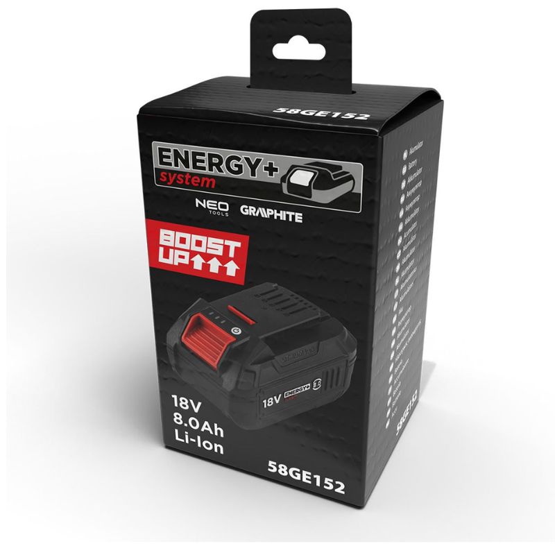 Графітова енергія+8 AH (58GE152) - це ефективне джерело електроенергії , що передбачають інструменти з енергії+, ідеально підходяться до фахівців. Завдяки ємності 8 AH та 18 В номінальній напрузі, вона забезпечує довгу роботу без необхідності частого зарядки.