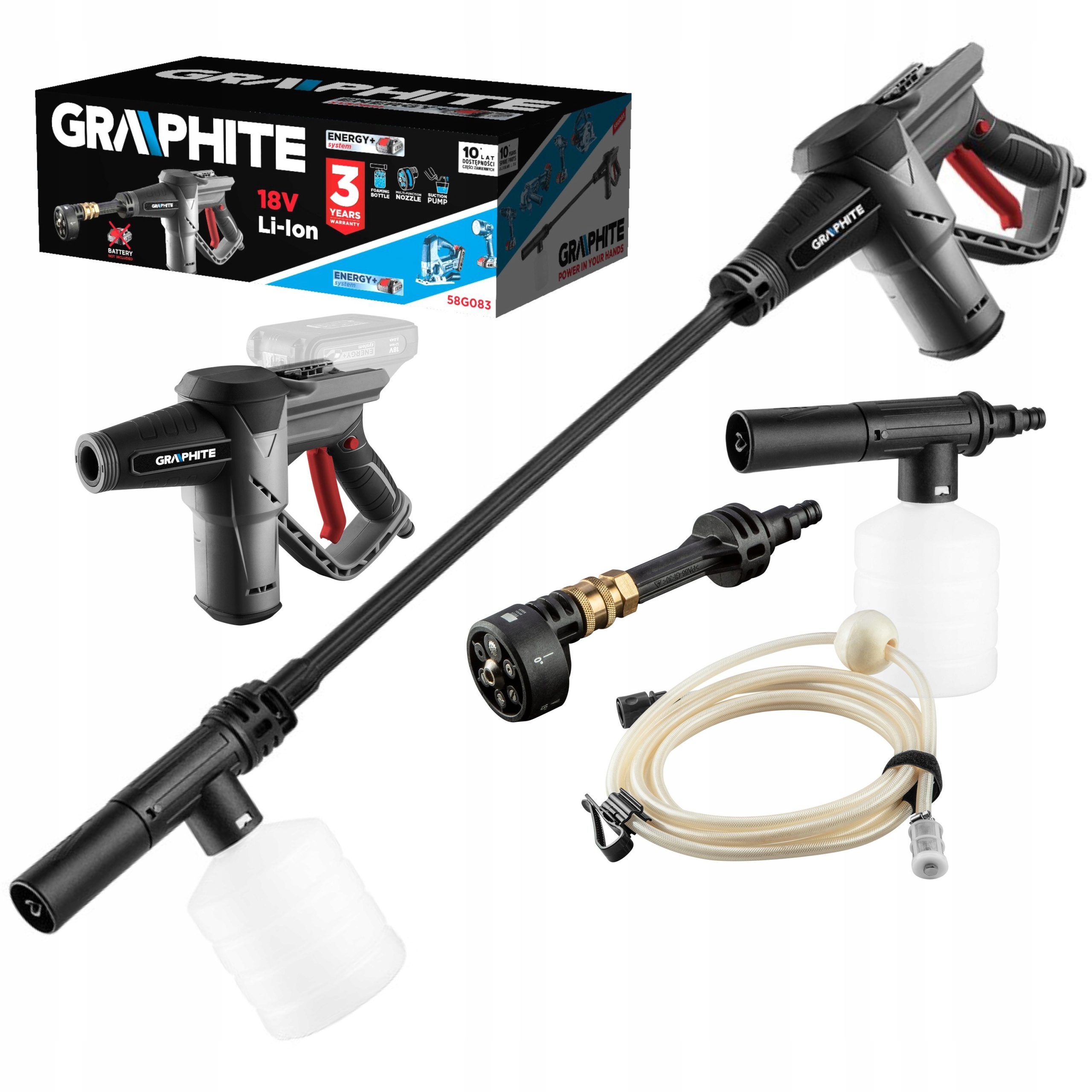 Акумуляторна мийка високого тиску, 58G083, GRAPHITE - це високоякісний пристрій, що живиться від батареї 18 В Energy+ установка постійного джерела води не потрібна. Мийка має два рівні потоку, а насадка має 6 регульованих типів струменів, що дозволяє регулювати робочі параметри відповідно до характеру поверхні, що миється, наприклад, меблів для патіо або велосипеда. До приладу також додається піноутворювач, який утворює піну, завдяки якій можна впоратися навіть із найстійкішим забрудненням.