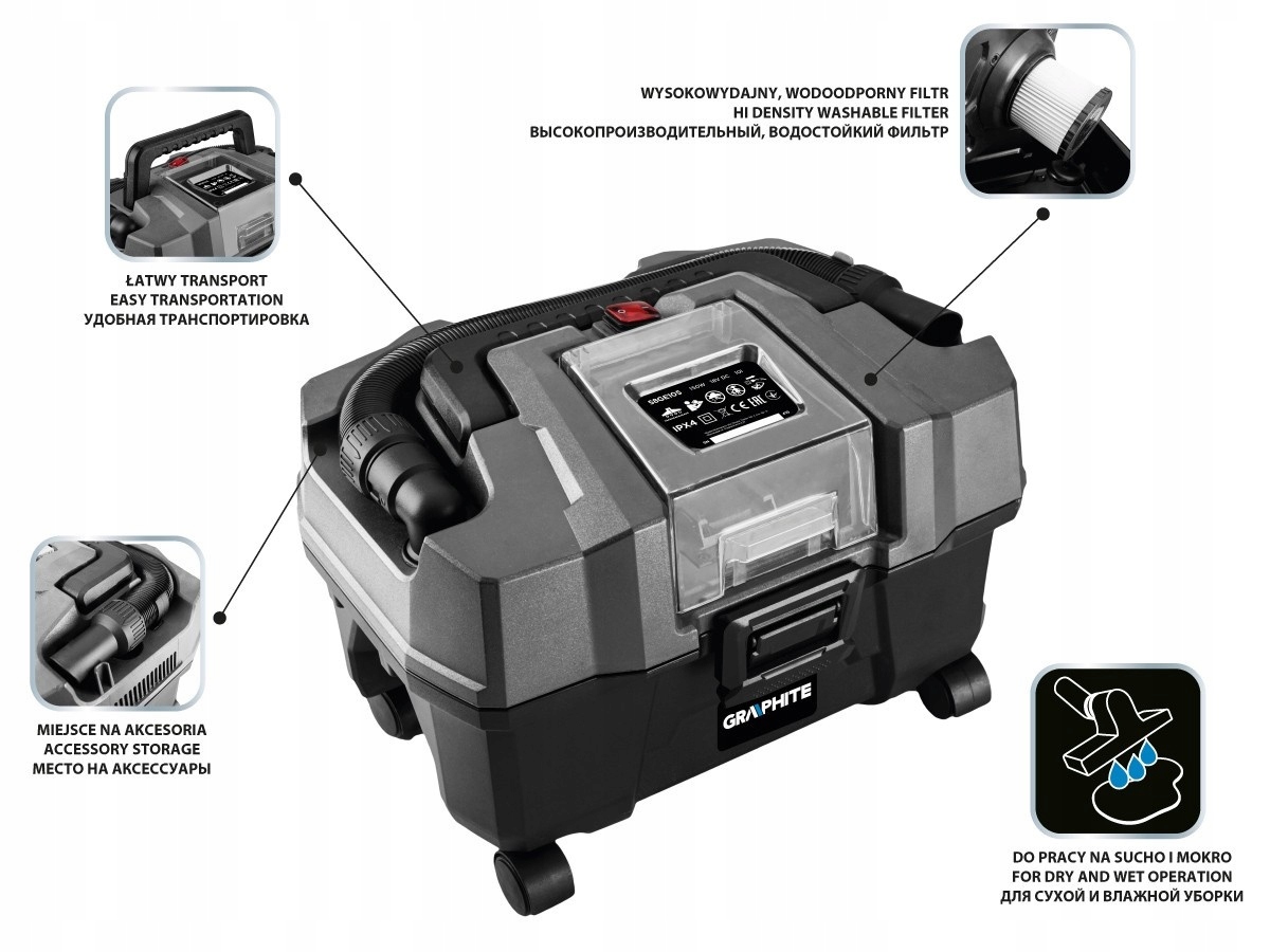Вакуумний очищувач для семінару+ 18 В, Лі-іон, 10 л, без акумулятора 58g105 Графіт-це довідка, що дозволяє вам ефективно виконувати та налаштувати пристрій високої якості. важкі умови праці. Завдяки інноваційній енергетичній системі акумулятора від графітового бренду, пилосос може працювати бездротовим чином, що збільшує його мобільність та еластичність. Пристрій може працювати сухим і вологим, що дозволяє ефективно чистити різні види поверхонь. Завдяки вакуумній функції також дозволяє видалити листя, пил та інші домішки з твердих місць, таких як, наприклад, ніші. Ці фільтри забезпечують ефективну повітряну фільтрацію мікроорганізмів, пилу, пилу та інших шкідливих речовин, захищаючи двигун вакуумного очищення від пошкодження. 58G105 Графіт забезпечує повну функціональність та відмінну продуктивність у різних умовах праці. Пристрій зручно транспортуватись завдяки набору чотирьох коліс та висувної ручки. акумулятор. Спеціальні акумулятори для графітових електроінструментів пропонуються в широкому діапазоні ємності. Система Energy+ дозволяє комфортно використовувати багато пристроїв, не боячись розширити кабелі або шукати місцеві джерела електроенергії. Вакуумний очищувач у наборі без акумулятора. Вологі