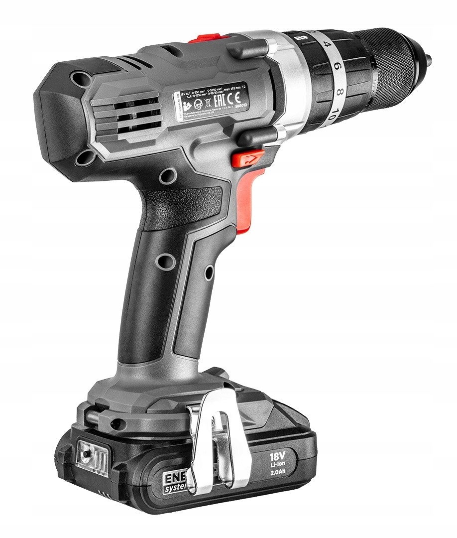 Двошвидкісний ударний дриль/шуруповерт GRAPHITE, сумісний з літій-іонними акумуляторами 18 В GRAPHITE Energy+. Це міцний пристрій для роботи в складних умовах, в тому числі з будівельними матеріалами. Працює з акумулятором серії Energy+ ємністю 2 Ач або 4 Ач. Електроінструмент має плавне регулювання швидкості на 2 передачах і оснащений перемикачем напрямку обертання. Самозатискна металева ручка дозволяє використовувати аксесуари діаметром 2-13 мм. Максимальна швидкість шпинделя на першій передачі становить 350, а на другій передачі 1250 об/хв. Частота механічного впливу на першій передачі досягає 5250, а на другій передачі досягає 18750 ударів на хвилину. Максимальний крутний момент становить 35 Нм (м'яке загвинчування) / 55 Нм (жорстке) і регулюється за допомогою 16-ступінчастої муфти з додатковим швидким перемикачем режимів роботи для загвинчування, свердління та ударного свердління.