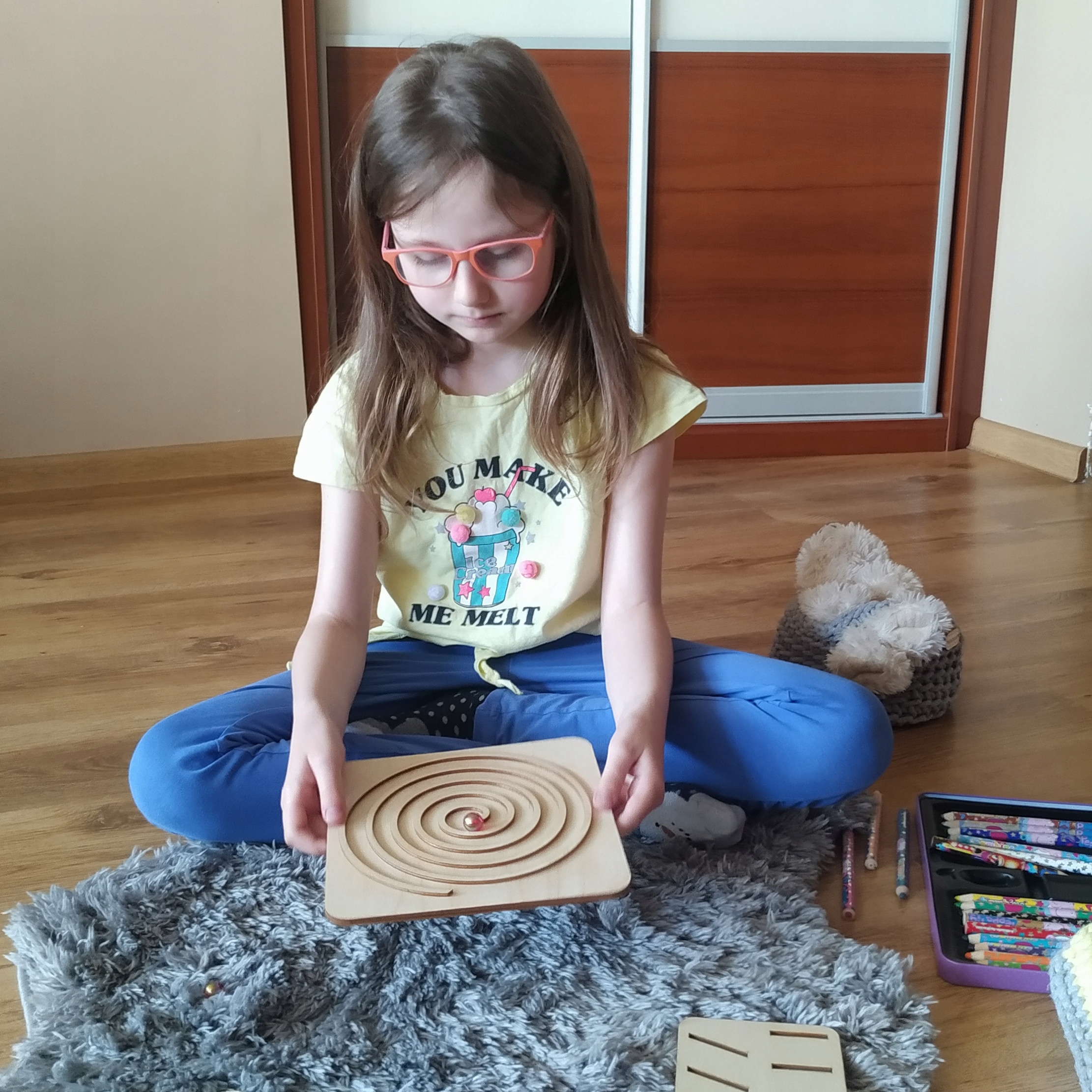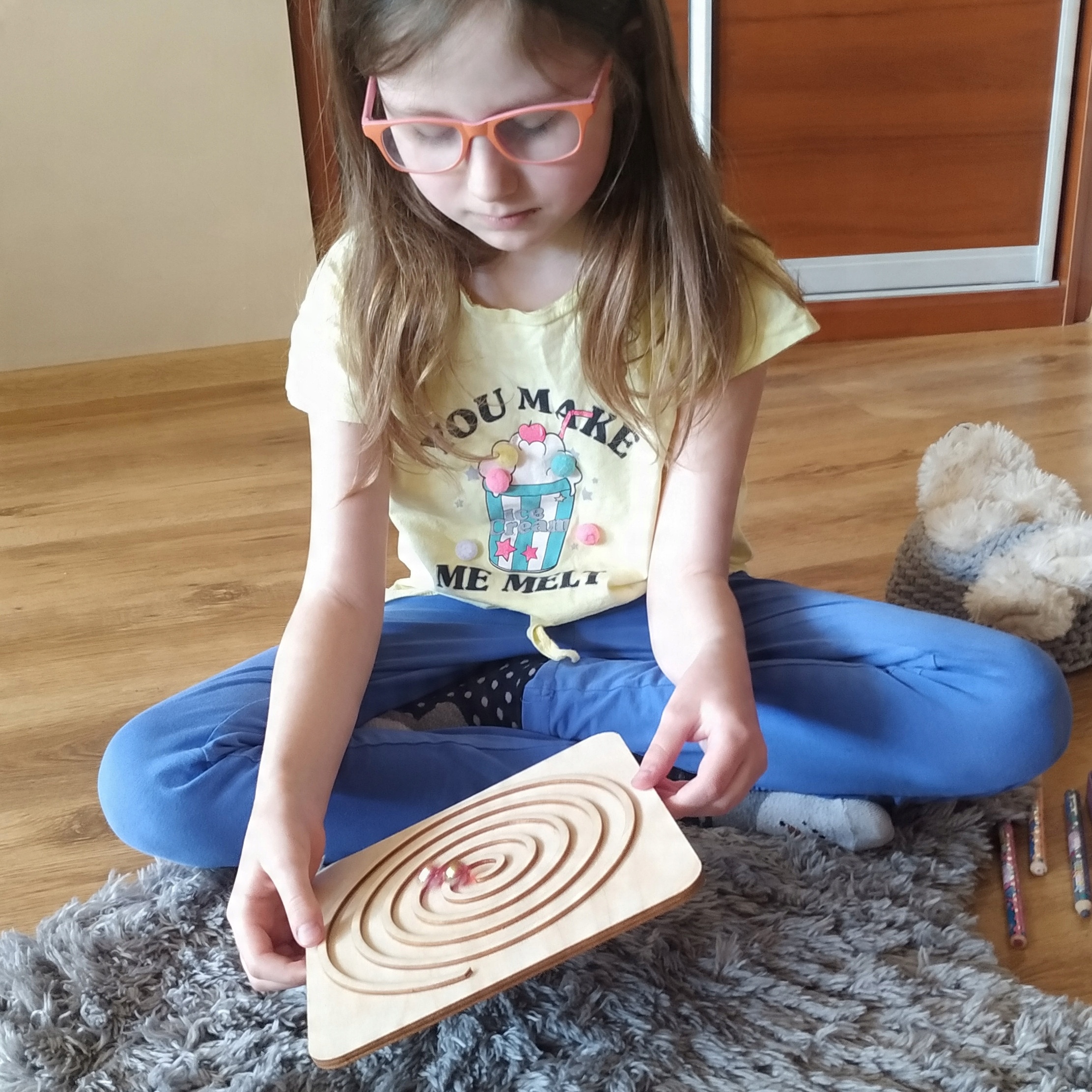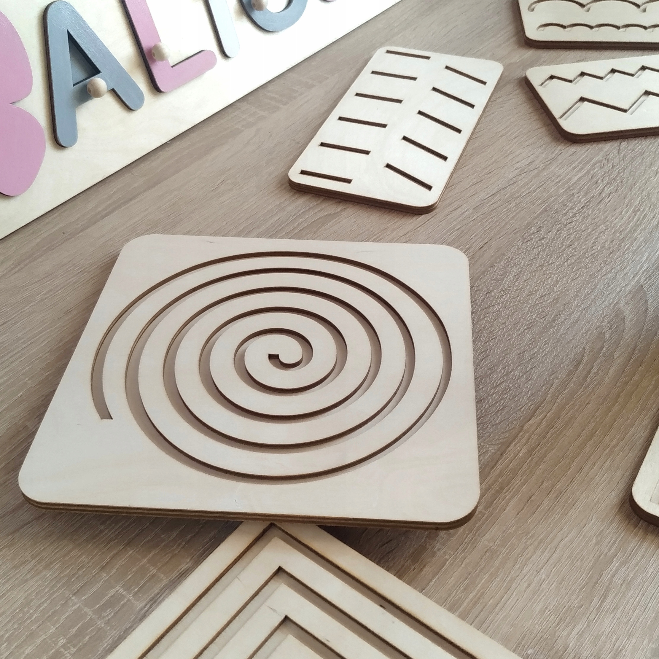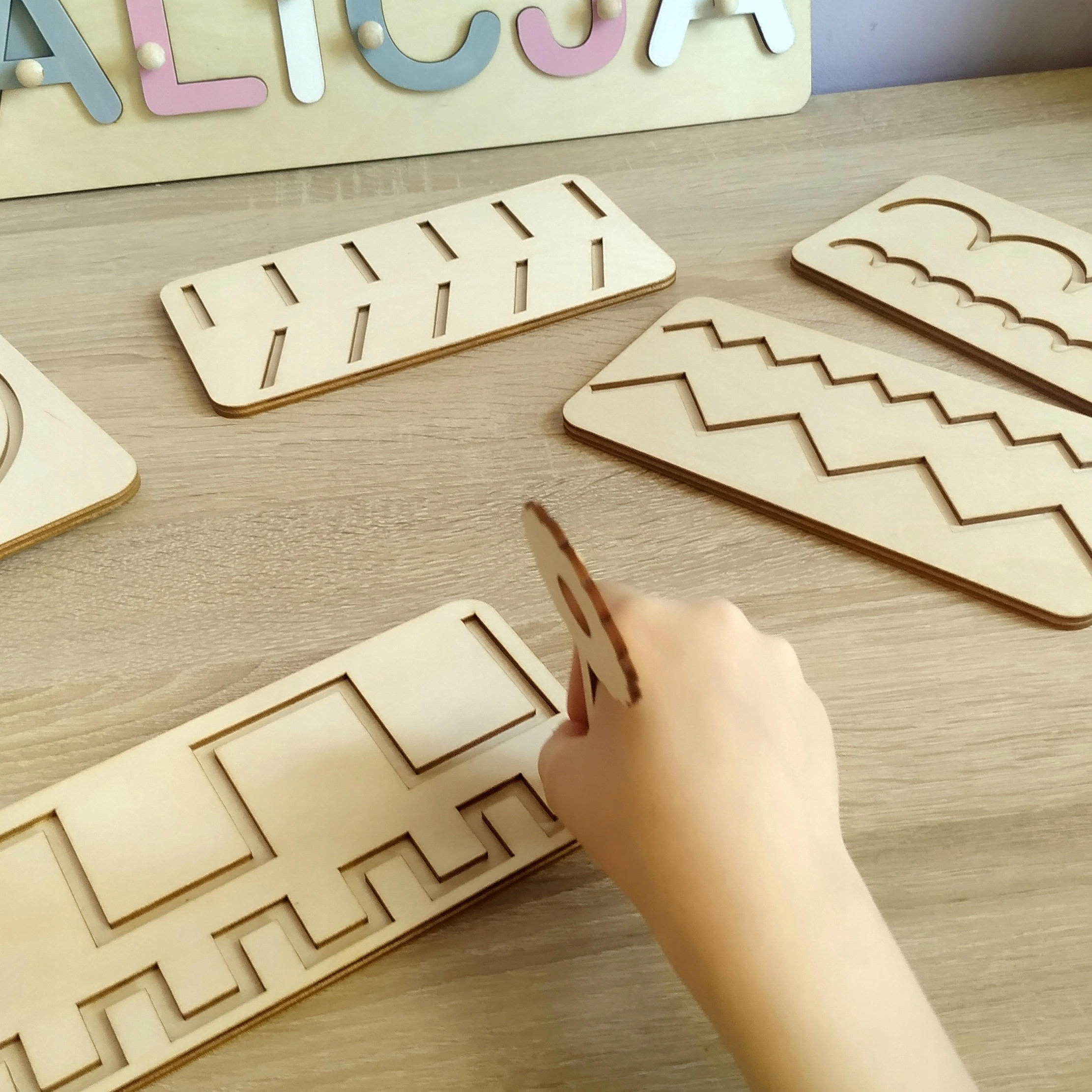 Важливою частиною підготовки дитини до дитячого садка є відпрацювання графомоторики рук, щоб вони не мали труднощі, серед інших. з письмом. На фанерних дошках вирізані візерунки. Дошки постачаються зі стилусом з твердої деревини, щоб не залишати слідів. Глибина ліній була вибрана таким чином, щоб змусити практикуючого натискати стилус із силою, подібною до фактичного процесу письма. Допомога розвиває графомоторику та формує звичку правильно тримати письмове приладдя.