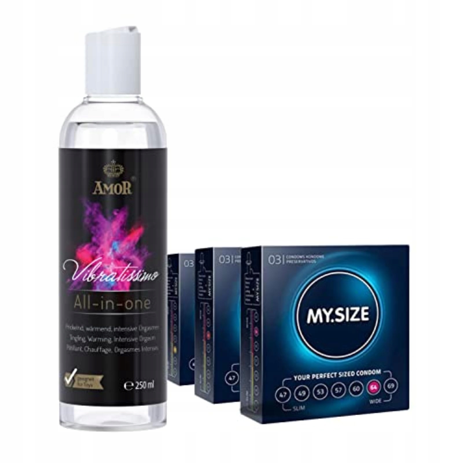 - Набір презервативів мій. Зволожуючий вібратісімо "все в одному" та 3 презервативи My.size розміром 57, 60 та 64 мм.