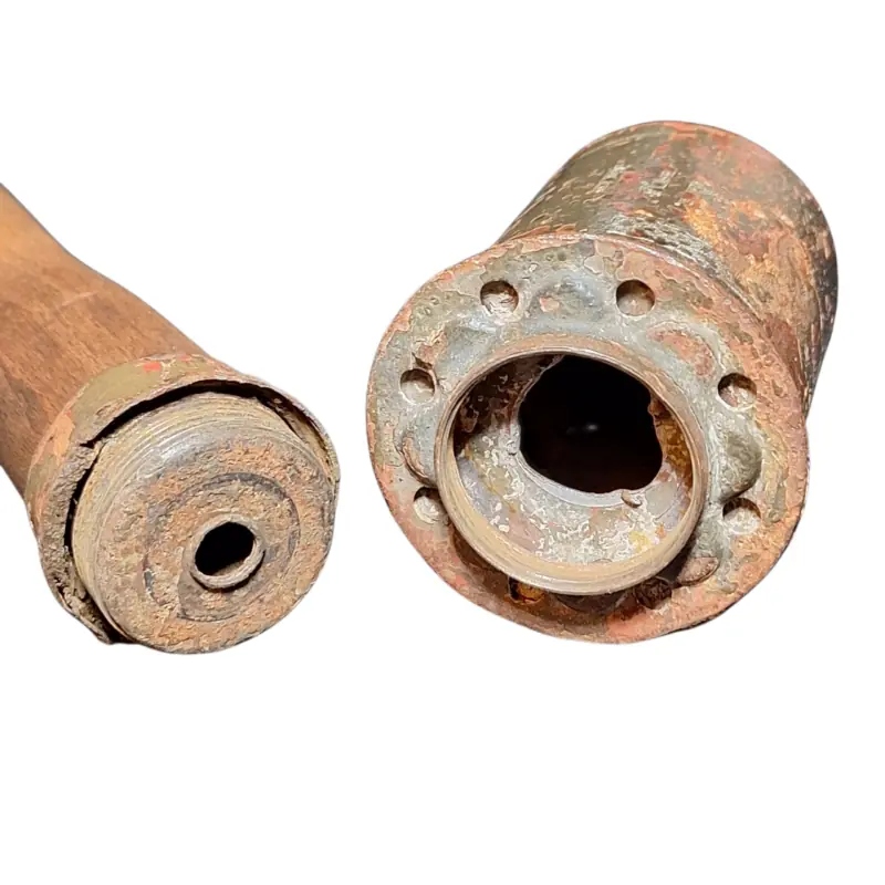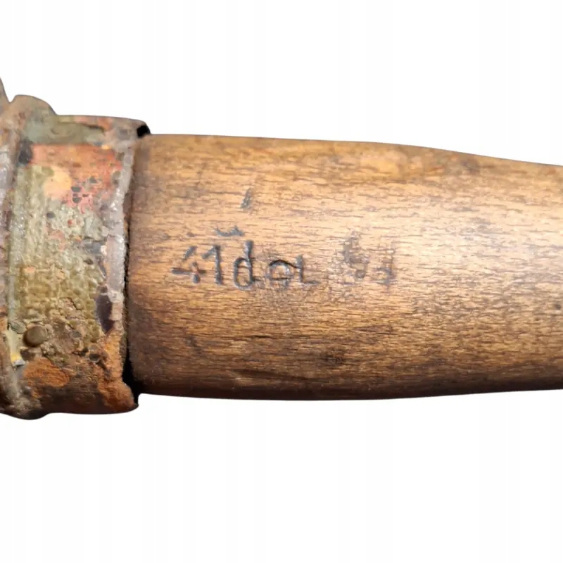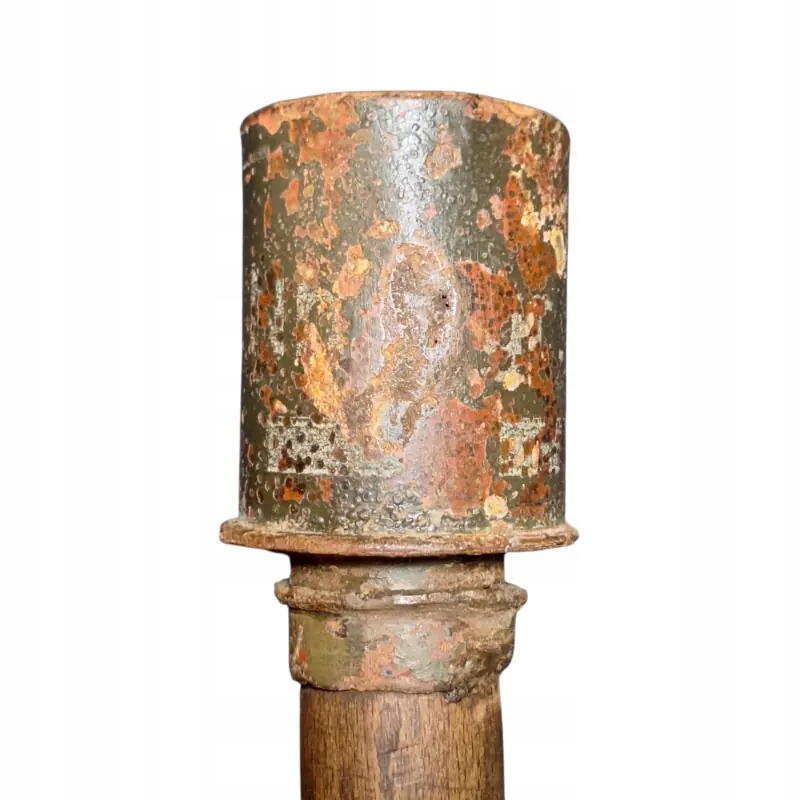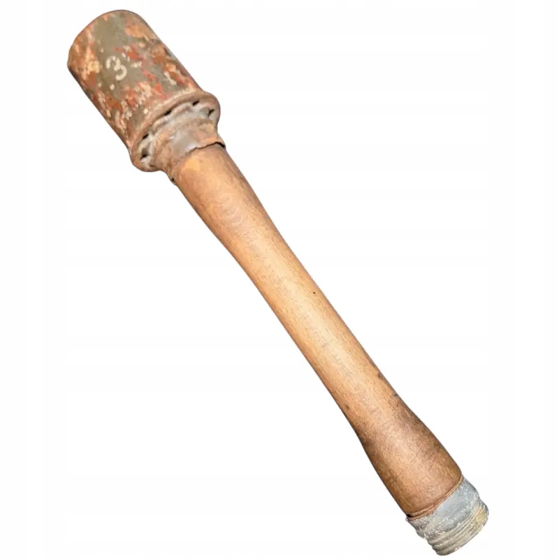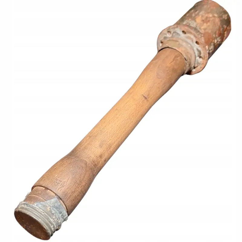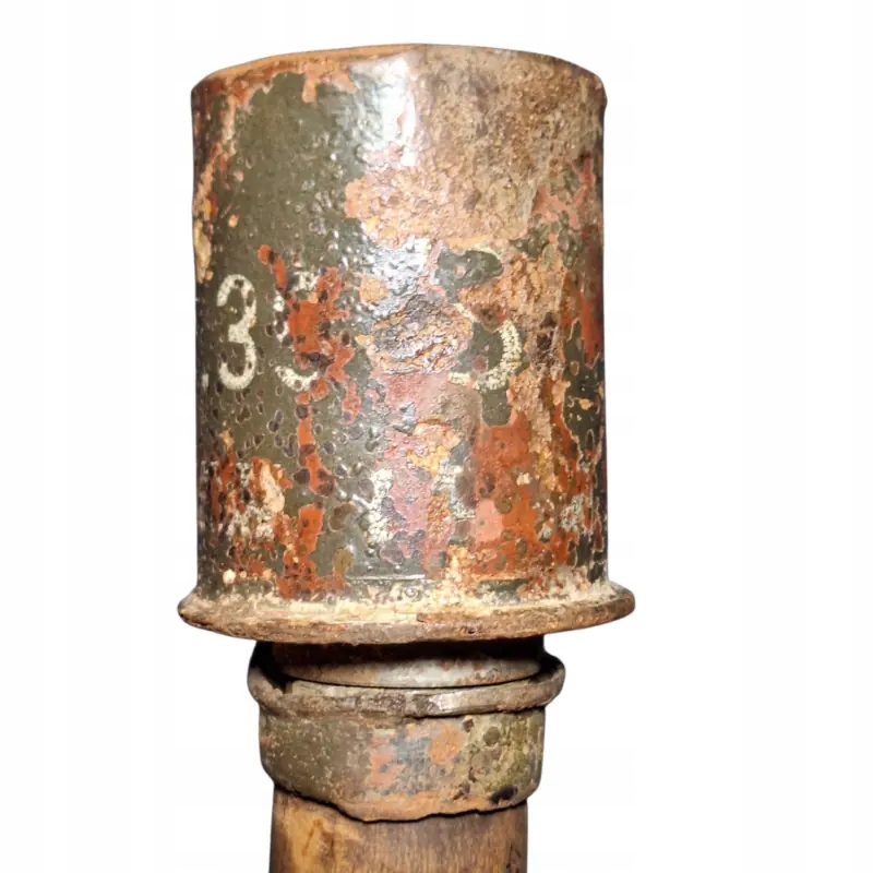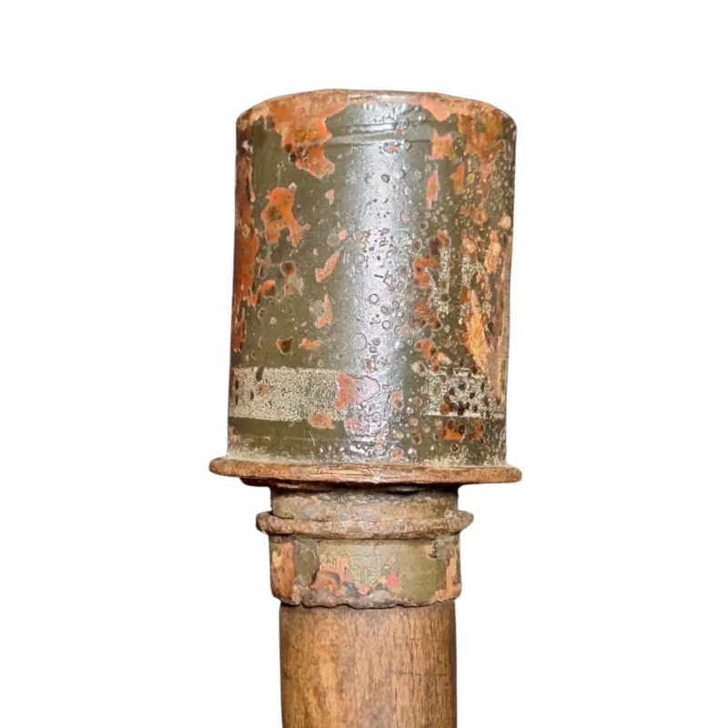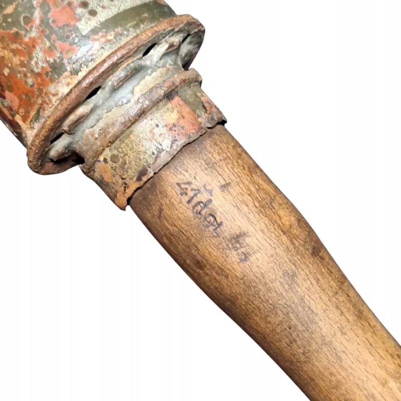 Німецька димова шашка m 39 Nebelhandgranate, видима фарба на голові з білим маркуванням димової шашки, чудово збережена ручка з підписами, частково збережена різьба та гайка знизу, як граната, так і гайка щільно тримаються на ручці після затягування.