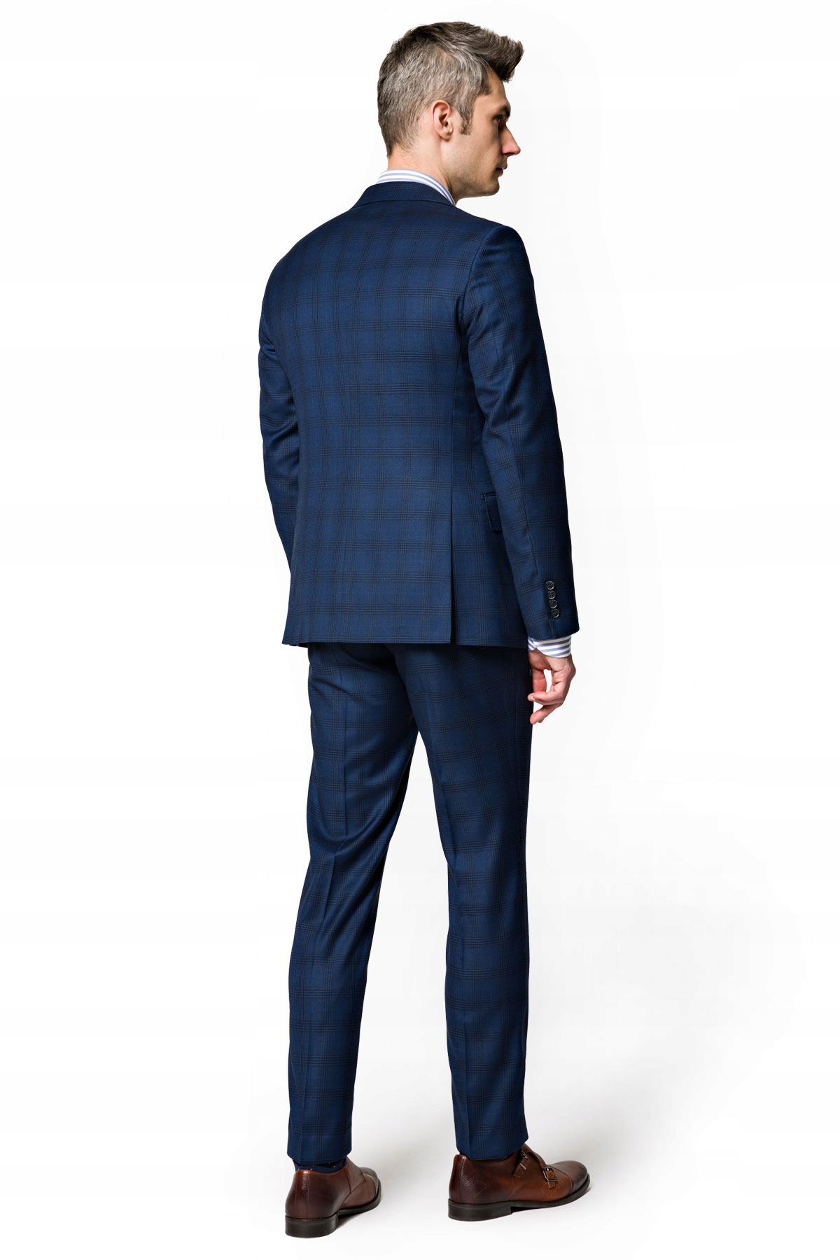 Чоловічий костюм-двійка Данія в колір темно-синій картатий. У цій моделі ви відчуєте комфорт і елегантність з відтінком спортивності. Костюм складається з однобортного піджака на двох ґудзиках і брюк без складок, злегка завужених донизу. Піджак має дві прямі кишені з клапанами та нагрудну кишеню.