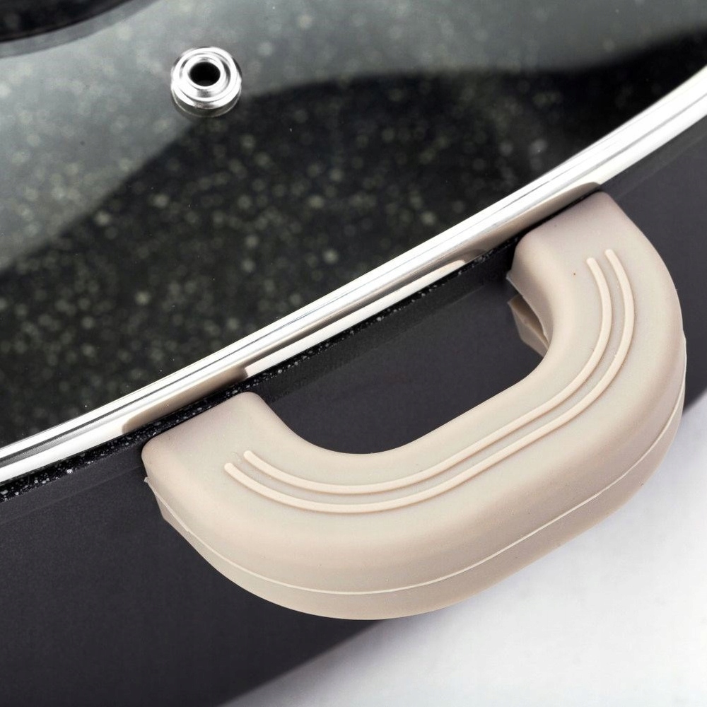✅ УНІВЕРСАЛЬНИЙ - Підходить для газових, електричних, керамічних, галогенних та індукційних плит. Можна використовувати в газових і електричних духовках. Блюдо має силіконові кришки для ручок, щоб уникнути опіків після виймання страви з духовки.