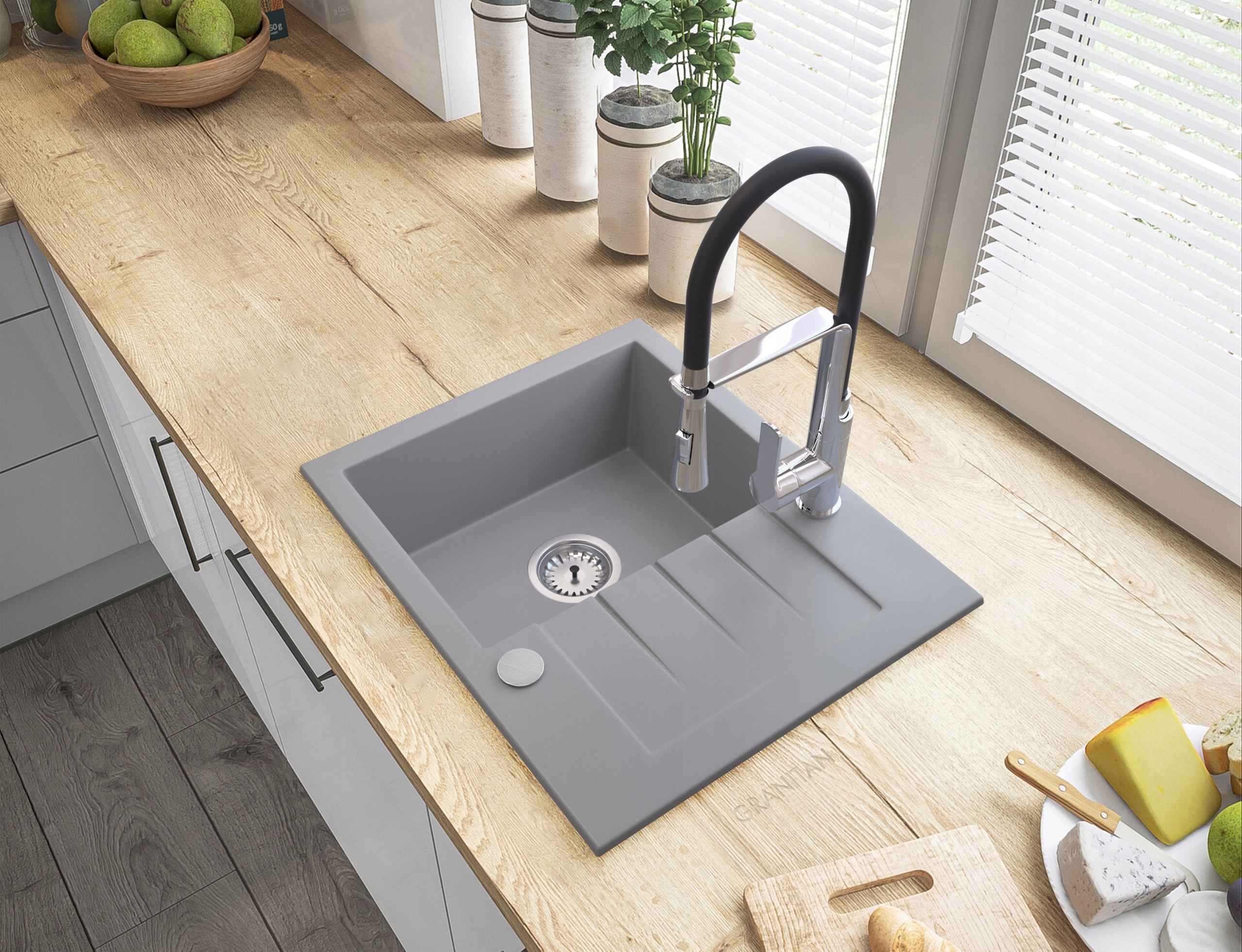 ГРАНІТНА МИЙКА З СИФОНОМ ДЛЯ ЗЛИВУ ТІНОС СІРИЙ