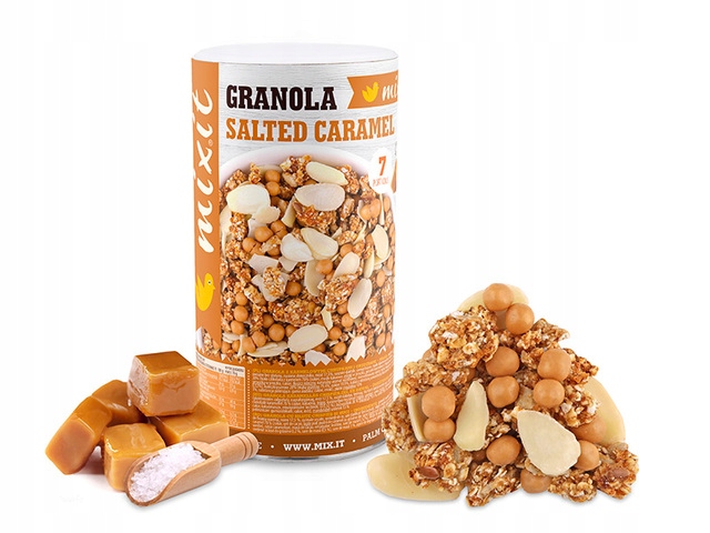 До асортименту солоної карамелі додано новий продукт з печі! :) Оригінальний рецепт граноли Mixit просто створений для змішування з солоною карамеллю. Запечені медові шматочки ми доповнили фініками, а безглютенову вівсянку – насінням льону та соняшнику. Нарешті ми посипаємо все мигдальними пластівцями, і ми просто не можемо їм натішитися. Застерігаємо від негайного закохування! :D