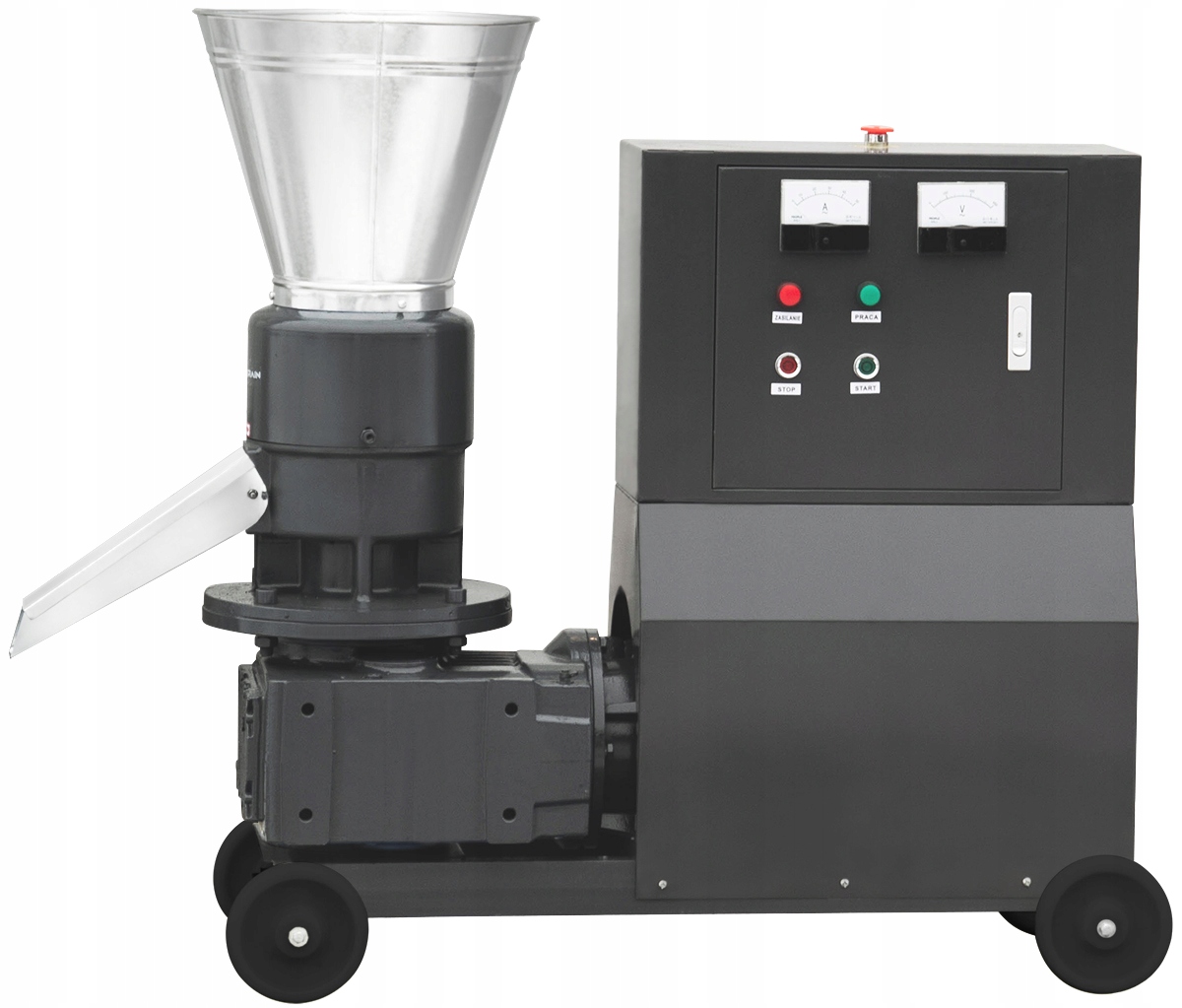 Мотор високої потужності (11 000 Вт) гарантує чудову продуктивність пелет-машини. Він здатний виробляти 500 кг пелет на годину. Спеціальне гальмо безпеки забезпечує захист користувача. Відносно невеликий розмір і 4 колеса дозволяють зручно транспортувати все.