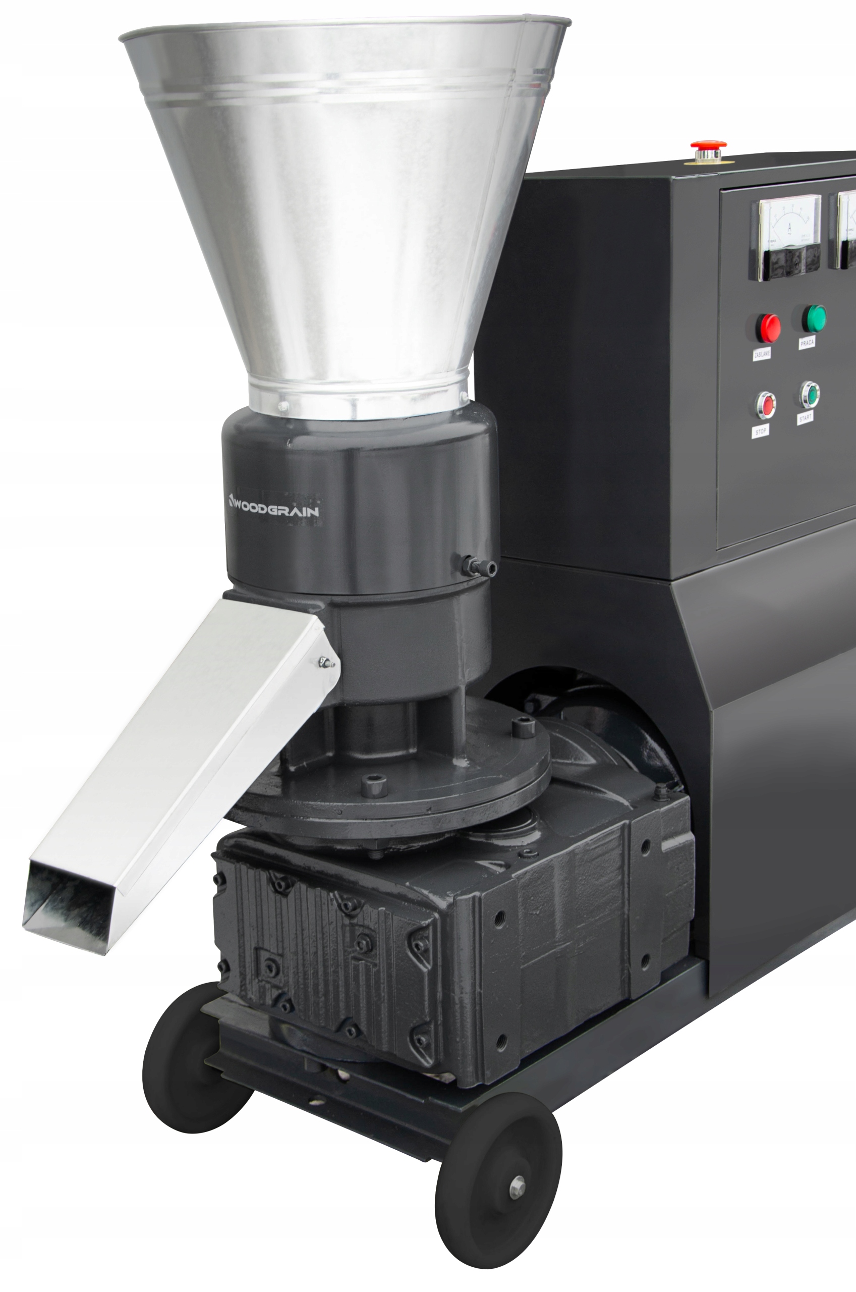 Машина оснащена змінною матрицею 6 мм з 3 обертовими притискними роликами, завдяки чому ми отримуємо пелети діаметром 6 мм. Притискні ролики притискають матеріал і вдавлюють його в матрицю.