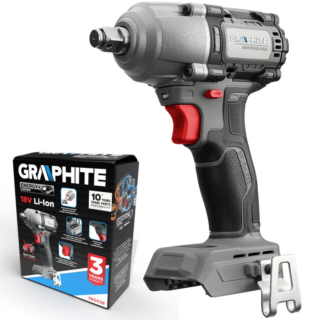 Безщітковий ударний гайковерт Energy+ 58G038 450 Нм від GRAPHITE — це інструмент, оснащений суцільним безщітковим двигуном і ½-дюймовим патроном.