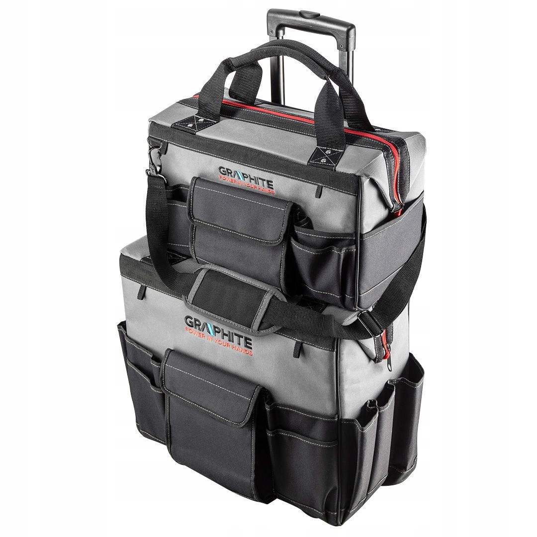 Набір міцних сумок для електроінструментів GRAPHITE Energy+ на рамі з телескопічною ручкою та колесами забезпечить мобільність у роботі. Велика місткість сумок означає, що в них є місце для багатьох електроінструментів, ручних інструментів і аксесуарів. Міцний матеріал із щільним плетінням, ламінований зсередини, гарантує довговічність, стійкість до стирання та захист від вологи та несприятливих погодних умов. Велика сумка оснащена колесами, телескопічною ручкою і 11 зовнішніми кишенями. Середня сумка має регульований плечовий ремінь, ручку для перенесення, 8 внутрішніх кишень, 2 гачки для інструментів і 7 зовнішніх кишень. Батареї та інші елементи можна зафіксувати від переміщення за допомогою додаткових ременів на липучках.